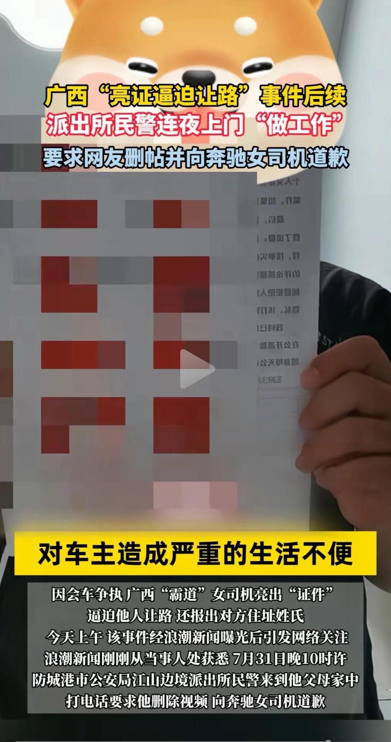 你不让路我亮证了了哈,视频车主扫一眼,大概是某行政执法证。事情就像奔驰车主说的那样,当晚就有派出所找到视频车主,要求他删除视频,并对女司机进行道歉。最终还是低头了。古话说的好,光棍不斗势力。
