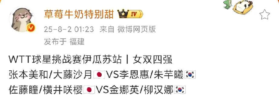 预料之中, WTT球星挑战赛伊瓜苏站女双1/4决赛今日凌晨一点多结束,和预测的一模一样。 在没有中国队参赛的情况下女双就是日韩的天下啦,不过这次比较公平合理,半决赛两对日本组合分别对战两对韩国组合, 大概率这次冠军又要花落日本,我们国乒要在培养双打上下功夫了,而且要高度重视起来! #晒图笔记大赛#