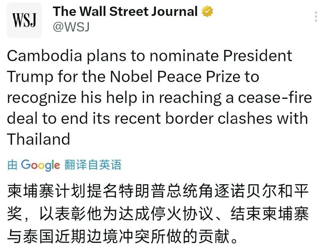 洪玛奈感激特朗普调停泰柬冲突、对柬关税手下留情,称柬埔寨计划提名特朗普角逐诺贝尔和平奖,以表彰他为达成停火协议、结束柬泰边境冲突所做的贡献! [机智]洪玛奈这波操作,活像给关税大棒系上和平绶带,刚领受特朗普从36%砍到19%的关税恩情,便提名其角逐诺奖,这颁奖速度比网红带货还快,要说调停功力,特朗普怕是把胡萝卜加大棒玩成了关税计算器:用贸易协定逼泰国谈判,再用关税减免给柬埔寨发和平奖,只是这停火协议墨迹未干,边境炮声余响还在,诺贝尔委员会怕是得先确认:这奖是颁给调停者,还是关税威胁大师?