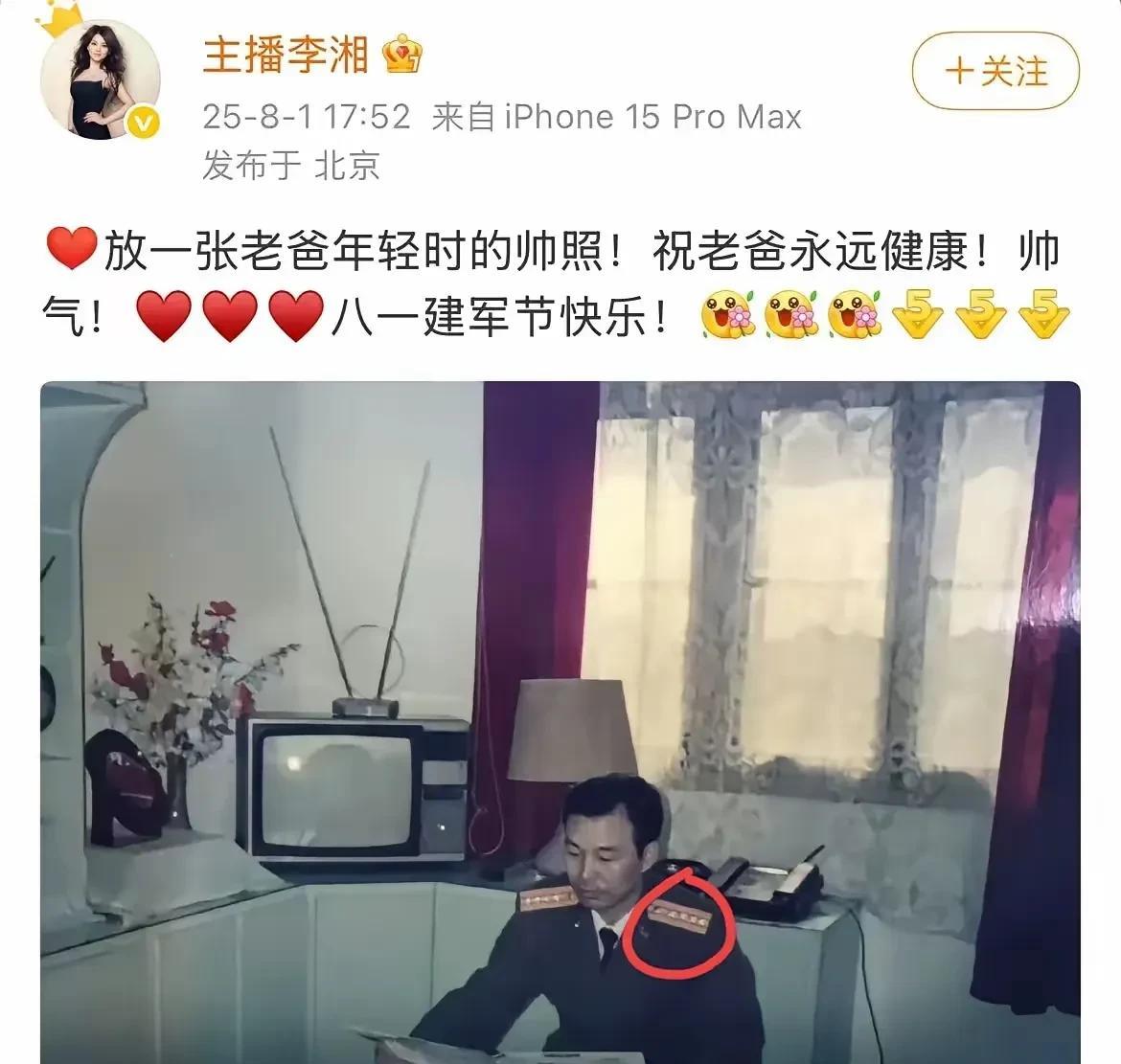关于最近李湘与释永信的照片热点,李湘用了一张照片回复,这张照片确实铿锵有力,掷地有声。 李湘配图:放一张老爸年轻时候的帅照!祝老爸永远健康!帅气!八一建军节快乐! 很明显,李湘并没有收到网络事情的影响,用这张照片证明自己内心的强大,网络上的事情自己根本不在意,我还是我,清者自清,浊者自浊。 从照片上看得出,李湘父亲应该是上校军衔,那个时候家里就有了电视机,说明家庭条件很好,果然是好的教育才能培养出来优秀的孩子,李湘当时号称湖南卫视一姐,起步很早,通过自己的头脑与资源,早就赚的盆满钵满,根本不需要父亲的资产。 其实,网友的评论实在是太捕风捉影,有些事情确实或许离谱了,释永信不过是一位方丈,但是那个时候还不至于让这么多人欣赏吧!