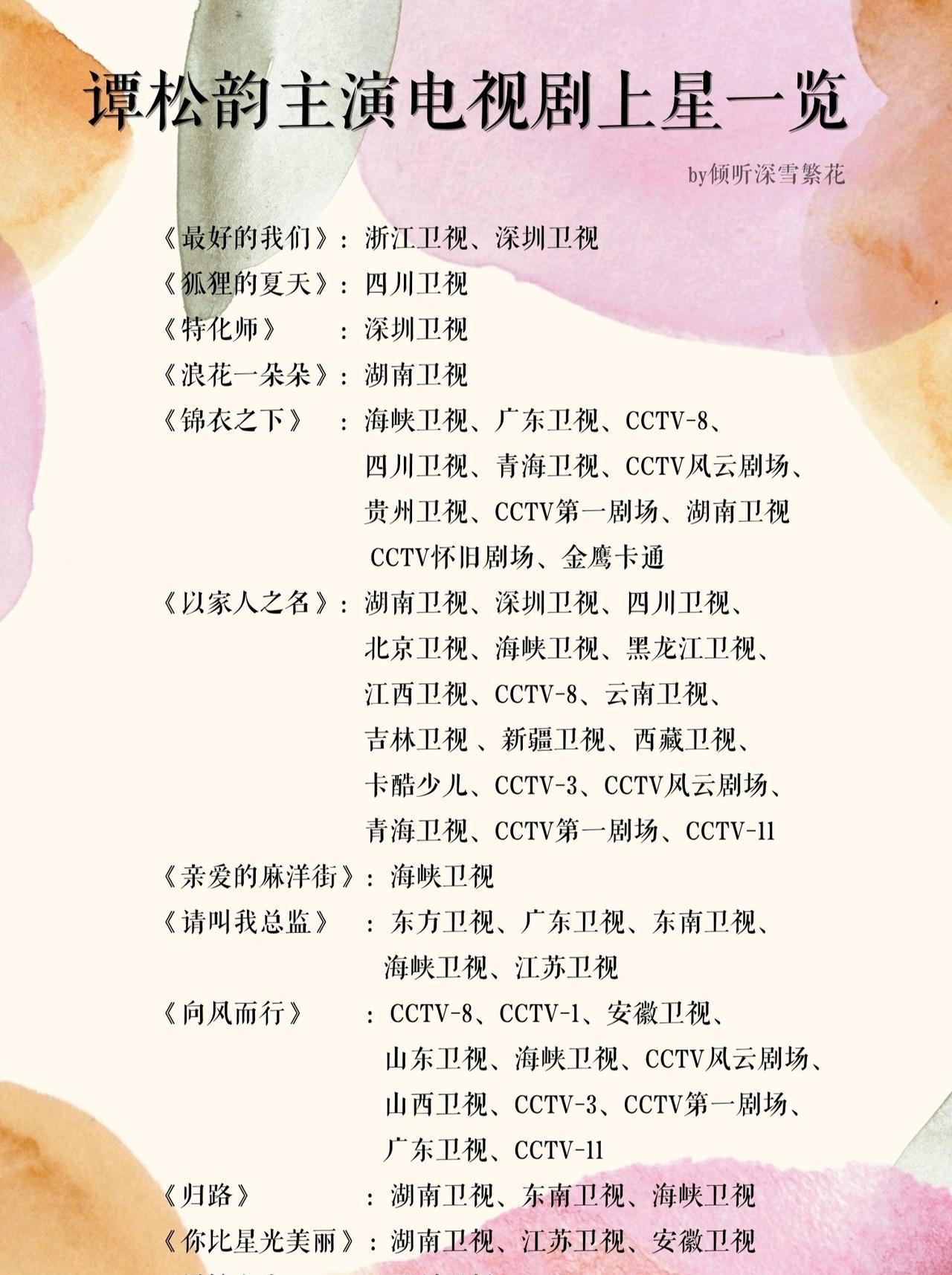 谭松韵主演电视剧上星一览! 数据截止2025年08月,谭松韵主演电视剧简直就是各大卫视的“香饽饽”!大爆剧平台都是抢着上星,而且重播的播放率也是蹭蹭往上涨! 例如《以家人之名》每年暑假必重温,《向风而行》白天档+深夜档轮播,观众依旧是百看不腻。还有三部待播剧,三个不同题材欢迎预约~ 最后你最喜欢松韵的哪部上星剧? #谭松韵# #谭松韵剧集口碑# #平台上星# #暑期档# #头号创作者激励计划#