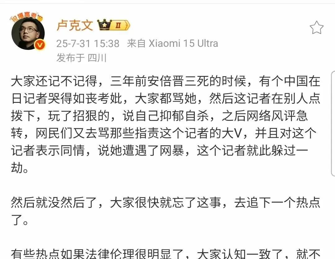 关于武汉大学图书馆事件,卢克文透过现象看本质,举了一个例子,虽然没有明说是杨景媛,但是让人感觉就是在评价这件事情。 卢克文说:三年前安倍晋三死的时候,有个中国记者在日本哭的死去活来,简直是如丧考妣,大家都骂她,然后这位女记者在别人的点拨下,玩了招狠的,说自己抑郁症自杀了,之后网络风评急转直下,网民又去骂那些指责这个记者的大V,并且对这个记者表示同情,说她遭遇了网暴,这个记者就此躲过了一劫。 看到这里,其实真正去同情那位女记者的人不多吧,毕竟日本前首相安倍晋三的死亡,日本人也不见得悲伤,她一个外国记者哭的如丧考妣,确实让人感觉太鬼扯了。 卢克文似乎是给杨景媛指了一条路,能够让这件事情平息风波,但是给肖同学造成的伤害应该有一个说法,现在当务之急就是要给肖同学恢复名誉,不能再蒙受不白之冤。