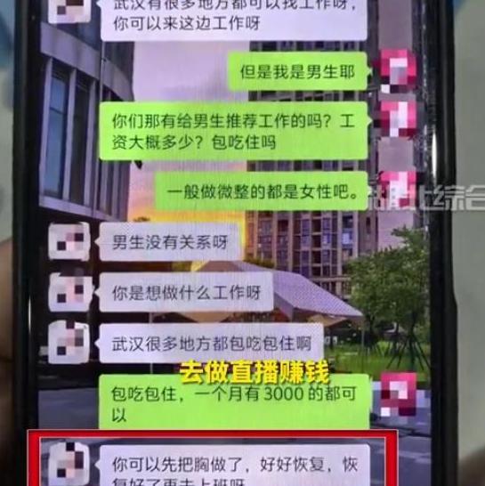 良心哪去了?湖北武汉,女子发现自己19岁的儿子突然做了隆胸,顿时感觉整个天都塌了,女子痛心表示,怎么有人这么黑心,自己的儿子有智力障碍,实际只有5岁的智力,而医美机构却为了利益就忽悠孩子,隆胸后可以直播赚钱! 忽悠一个男孩子做隆胸手术,真是让人闻所未闻! 可这事儿还真让人做成了,在2024年,湖北武汉的卢女士发现自己19岁人儿子竟然偷偷做了隆胸手术,她气的浑身发抖,悲痛不已,因为她的儿子虽然已经成年,但智力是不正常的,她呐喊:“现在的人良心都去哪了!为了挣钱这么不择手段吗?” 据悉,儿子在2024年自己招工的时候,接触到这家整形美容机构,在交流中,聊天机构一直声称直播赚钱,非常赚钱,还说做了整容手术更赚钱。 当时男生就说了自己没钱,对方就忽悠说可以贷款,一直用各种诱导性的语言忽悠男孩,丝毫没有对男生智力低下而于心不忍,为了能完成销售业绩,就带着他去了银行签字贷款,贷了3万出来后,在7月底给男生做了隆胸手术。 卢女士得知此事的时候,已经为时已晚,看着儿子胸前缠着绷带,卢女士实在难以接受,为了不让儿子担心,尽力控制自己要崩溃的情绪。 卢女士非常愤恨这家美容机构,这些医生到底为何要给一个19岁的男生做隆胸手术,于是她找到媒体曝光了此事。 在记者采访中,卢女士还拿出儿子智力低下和抑郁症的医院检查报告,声泪俱下的指责这家黑心的整形机构。 还忽悠了智力只有5岁的儿子贷款做手术,令人发指。 对此,网友们纷纷表示同情,网友直呼:“太缺德了,哪个正常的男孩子会同意做隆胸手术!” 有网友冷静分析,认为既然男生是智力低下者的话,那就没有民事行为能力,也就是说签的贷款是无效的,卢女士可以维权,要求让美容机构赔偿。 “光是想想就觉得窒息,家长得多崩溃啊…… 这孩子自己都不知道发生了什么。” 还有网友感慨:”这种以隆胸后可以直播赚钱为诱饵的‘赚钱噱头’就是在毒害社会,这样的情况一定要严厉禁止,直播挣钱真是毁三观!导致现在的人都总想着为了博眼球什么就都能做。 对此,你怎么看?