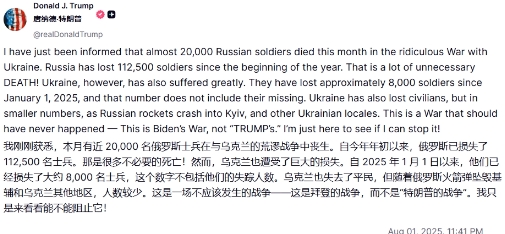 乌军“损失”8000人“消灭”俄军11万人?特朗普真敢吹…… 特朗普的“胡言乱语”,现在都已经不看数字多少了。 除了那条“下令部署2艘核潜艇以警告梅德韦杰夫”的推文外,1日有媒体注意到当天特朗普其实还发了另一条关于俄乌冲突的推文。 大概意思是说:不久前有人告诉特朗普,自今年年初以来俄军已经“损失”了11.25万人,而乌军才“损失”8000人,所以特朗普声称俄乌不能再打下去了,虽然这是“拜登的战争”,不是“他特朗普的战争”,但他仍希望尝试结束这场战争。 说实话,就特朗普罗列的这组俄乌伤亡数字,槽点不是一般的多:既然乌军从今年年初至今以“损失”8000人的代价就“消灭”了11万俄军,这不正说明乌克兰打赢战争、俄罗斯崩溃指日可待,怎么特朗普还要急着斡旋停战呢? 还真别说,俄乌冲突打到现在,哪怕乌克兰的防线一直在后退,但北约和西方还真的就相信俄军的伤亡高于乌军。 比如,2023年乌军春季大反攻失败的原因之一,就是因为北约在制定作战计划时参考了他们收集的2022年俄军伤亡数据,想当然地认为只要西方援助的“豹2”坦克发起进攻,俄军防线将“不战自溃”……