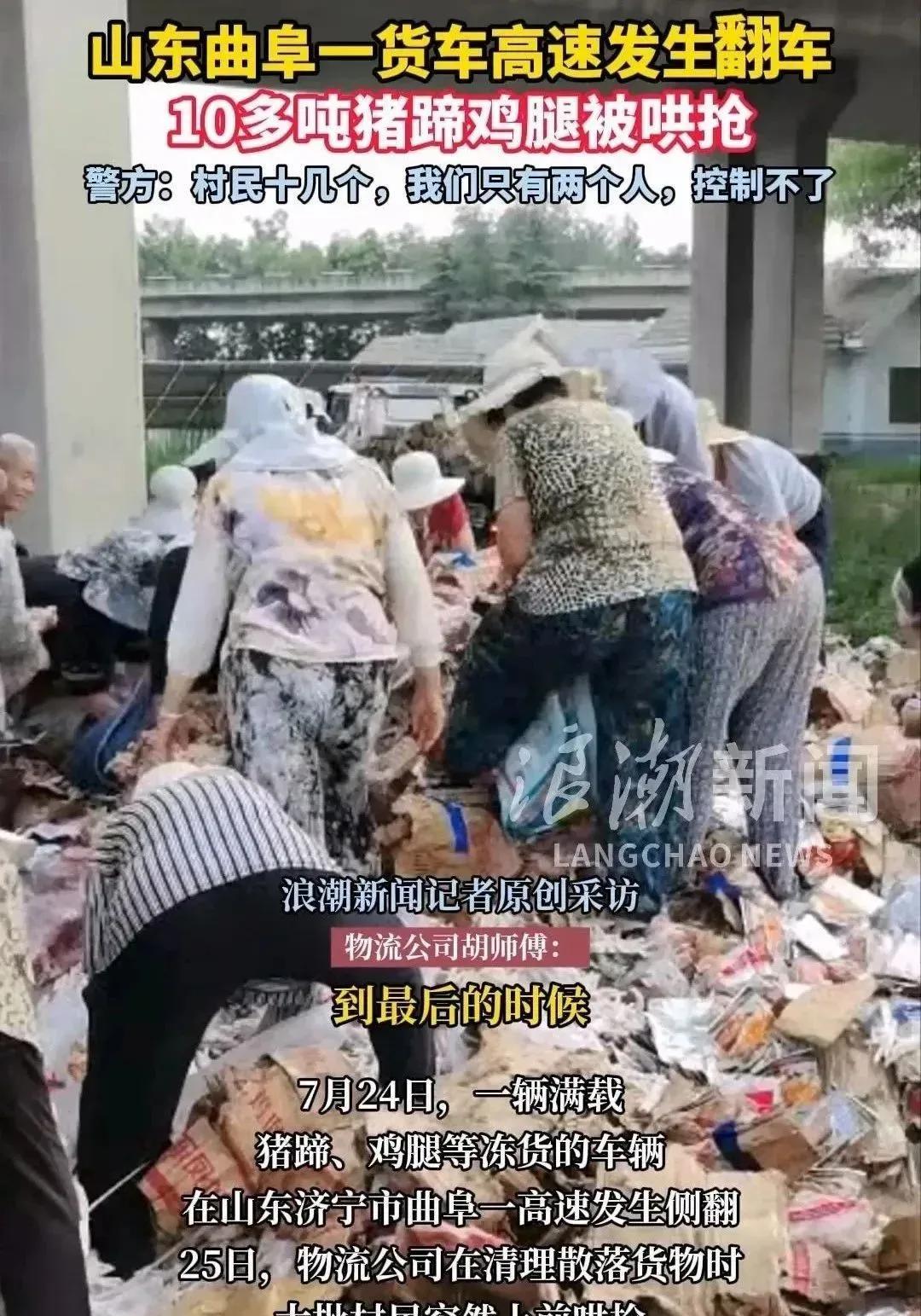 孔子老家曲阜,竟然发生哄抢货物事件!!! 2025年了,在孔子老家竟然发生这种事情,简直是不敢想象,不可思议,不忍直视。 7月25日,山东曲阜附近一货车坠桥,10吨鸡腿猪蹄等冻品遭村民哄抢,随后派出所民警到现场制止,然后质问这些村民:这是你们的么,你就拿,你们好意思么?但是大家似乎无动于衷,还是继续拿。 目前货车车主称:损失约40万元,这是抢劫,欲立案追回。 给曲阜派出所民警点赞,民警到达现场后,严厉呵斥。至少起到了震慑的作用。 极小数的几个人,成功地抹黑了整个曲阜,波及山东,连孔夫子都觉脸上无光。 有句古话说的好:穷生奸计,富长良心。 山东还得大力发展经济啊。