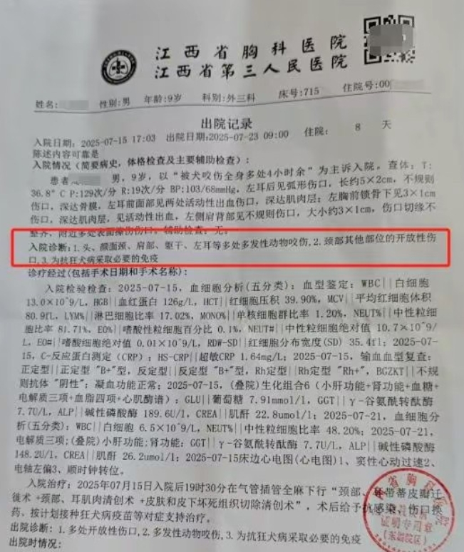 小杰这次伤得不轻。脖子周围被咬得没有一处好的,伤口结了厚厚的痂。光看医生到出院,已经花掉1万4千多块钱。