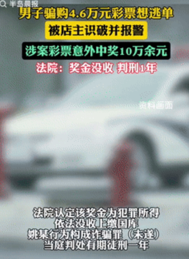 想白嫖?上海,一男子在彩票停售前20分钟,去彩票店买了4.6万元的彩票,因时间比较紧张,老板就先把票出了,不料,当向他要钱时,男子却百般推脱,察觉出不对,老板急忙报警,却没想到,竟得知男子是“霸王彩票”专业户!   据半岛晨报7月31日的报道,男子在来到店里后,就表现的非常着急,让老板赶紧把票给出了。   见状,老板就想让他先把钱给付了,不过,男子却表示出完票后就给钱,对此,老板也只好妥协了。   而在打完票后,便开始向男子要钱,可没想到,他却开始找借口,又是卡被限额刷不出那么多钱,又是待会让家人送过来。   当见到这一幕后,老板就觉得不太对劲,并没有把票交给他,反倒是直接打电话报警,没多久警察就过来了。   然而,在进行调查后就发现了问题,男子并没有工作,也只有他自己在这边,甚至此前还坐过两次牢。   并且这两次都是因“霸王彩票”进去的,买完票后不给人家钱,如今还想用相同的方式,来骗取彩票。   虽然这次他并没有得逞,但其行为已经触犯到法律,所以他就“荣获”1年的刑期,去里面继续改造了。   值得一提的是,他这次买的那些彩票里,竟然还有个中了奖,足足有10万元,于是警方从中拿出来一部分,用于弥补店老板的损失,其他的则没收上缴了。   那么对于这件事情,您有什么想说的呢?   信息来源:半岛晨报 2025-7-31