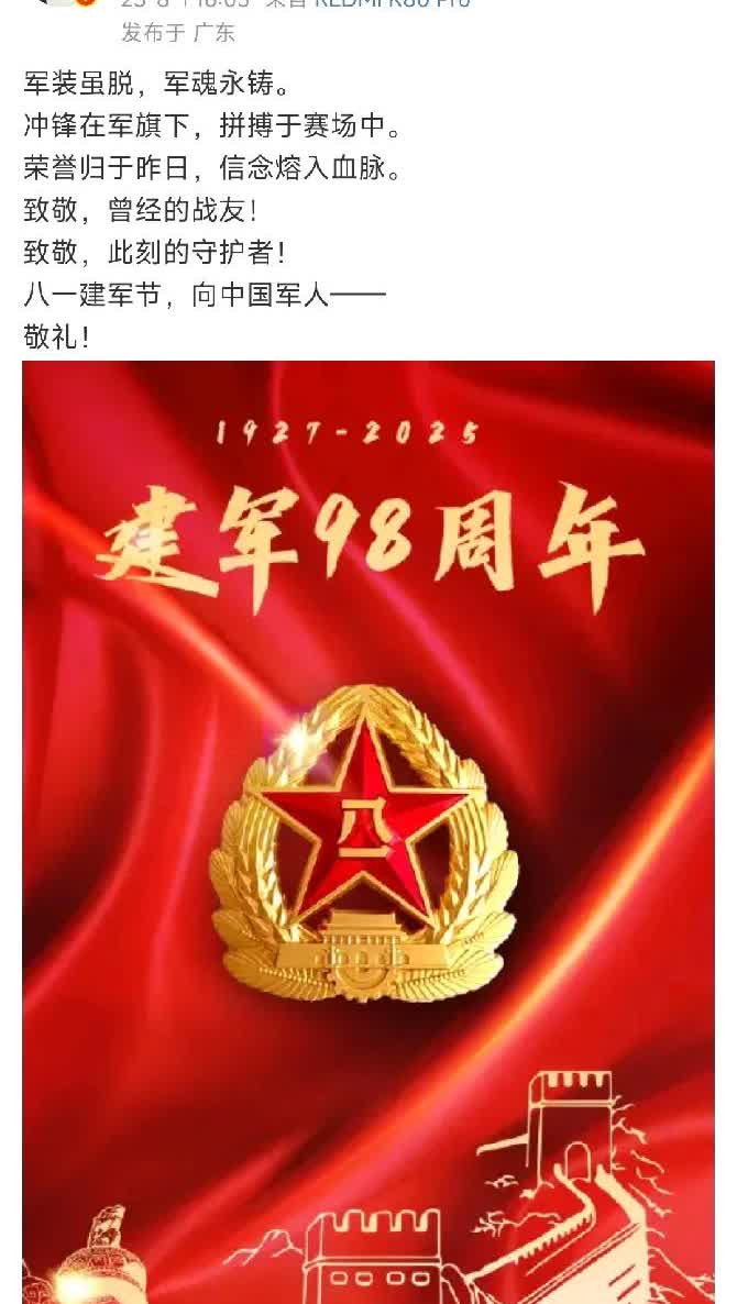 樊振东发博祝贺八一建军节! 有谁还记得樊振东是军人出身!还曾获得过一等功。 一个为国征战赛场的国家队运动员、退伍老兵,却屡屡遭受极端饭圈文化侵扰。 樊振东是国家英雄,如果社会风清气正,本不该遭受这么多不合理的辱骂骚扰。 樊振东真正追求的到底是什么? 扫荡邪风,风清气正的职业环境才是英雄们该拥有的工作环境。