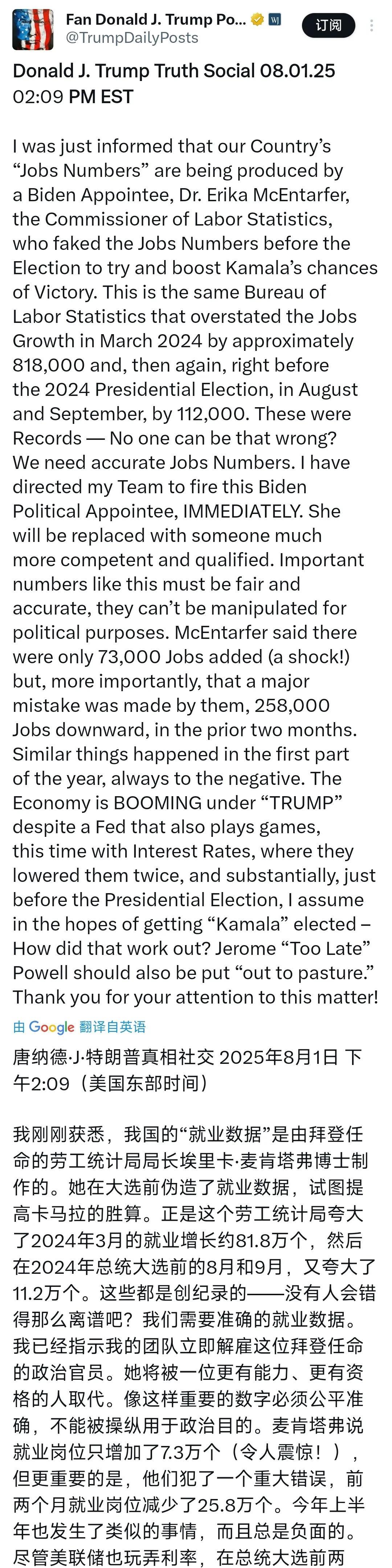 外媒今天(8月2日)报道:“特朗普解雇劳工统计局局长称就业数据被伪造。美国总统特朗普解雇了劳工统计局(BLS)局长麦克恩塔弗,此前数据显示美国7月份就业增长不及预期,而且前两个月的就业人数被大幅下修。” [机智]评几句:解决不了问题就解决提出问题的人。在抓经济和抓就业之间选择了先抓劳工统计局。经济搞不好,就整治那个没统计好数字的人。特朗普的做法也遭到了众多美国网民的调侃,对于劳工统计局局长是否是“害群之马”,以及特朗普是否肆意妄为,美国民众观点两极分化,足见这一事件在美国社会引发的巨大争议。(特朗普解雇劳工统计局局长的全文见图二。)