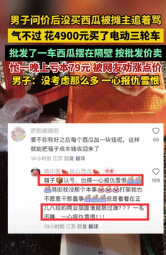 气性可真大!江苏南京,一男子去路边买西瓜,问完价格后觉得贵就没买,没想到,竟被摊主追着骂,男子气不过,就花4900元买了辆三轮车,又批发了一车西瓜摆在隔壁,按照批发价来卖,以此来抢对方生意,不料,忙活一晚上,最后却发现亏本79元,可男子却觉得挺开心的! 据中国蓝新闻8月1日报道,男子带着自己的孩子出去吃烧烤,正好碰见烧烤摊对面有一对大爷大妈在买西瓜,男子就想着孩子爱吃西瓜,买一个给他吃,其次也当支持一些大爷大妈的生意。 当男子走到西瓜摊的时候,看见每个西瓜上都明确标上了价格,有的7块6,有的8块5,还有的9块1,不过看着西瓜都不怎么新鲜,就像放了很长时间一样。 这和他往常买的都不一样,以往买西瓜都是挑好要哪个西瓜,摊主都是现场将西瓜放到秤上称,是多少钱给多少钱,可这个大爷大妈不一样,将西瓜都提前称好了,谁来买西瓜看中哪个,直接付钱就行。 男子站在西瓜摊前,询问大爷大妈西瓜的价格怎么卖,有籽西瓜多少钱,无籽西瓜又是多少钱,当大爷大妈说了价格后,男子果断选择不买,首先价格他接受不了,在一个就是提前将西瓜称好标上价格,会不会是“鬼秤”? 为了不上当受骗男子准备离开,想着碰到别的西瓜摊在买,反正不在大妈大爷这里买,可看到他不买西瓜后,大爷大妈不乐意了,一直嘟囔着,说男子各种不好,这番话都被男子听到了,男子觉得买不买西瓜都是自己的选择,大爷大妈怎么能骂人呢? 男子受不了这个气,决定让大爷大妈看看他的“真本事”。男子立马花4900元买了一辆电动三轮车,然后批发了一车西瓜,就摆在大爷大妈的隔壁,抢他的生意。 他卖西瓜不为赚钱,为的就是解气,报仇雪恨。其他人卖西瓜可能会加一些价,好赚钱,可男子不同,他批发西瓜的时候是多少钱,卖给顾客就是多少钱,一点都不带加价的。 自从男子在大爷大妈旁边卖西瓜后,大爷大妈的西瓜摊无人问津,顾客都跑到男子那里去买西瓜了,大爷大妈非常眼红,可他们不敢降价,因为一旦降价他们就不赚钱了。 事后男子在算账的时候,发现忙活一天不仅不赚钱,反而还亏损了79元!虽然不挣钱,男子也没有不高兴,反而觉得挺解气的。 他这样做就是想让大爷大妈明白,做生意首先得讲诚信,不然很难有回头客,生意也不会做大的,更重要的是,顾客买不买西瓜,去哪里买西瓜都是人家的选择,不能因为人家不买西瓜,就感到不舒服,还指责人家! 网友们看到男子的行为后纷纷表示,不蒸馒头争口气,男子做的没毛病,就应该让大爷大妈长个记性,不能太过分。男子虽然亏了79元,但挣了口气! 对此,你们如何看待这件事?你们觉得男子做的对不对?