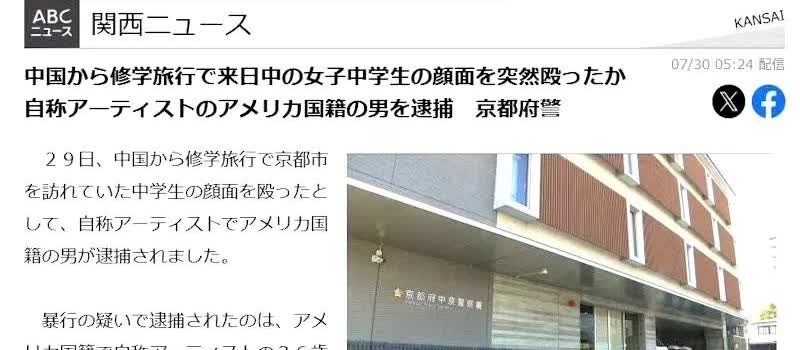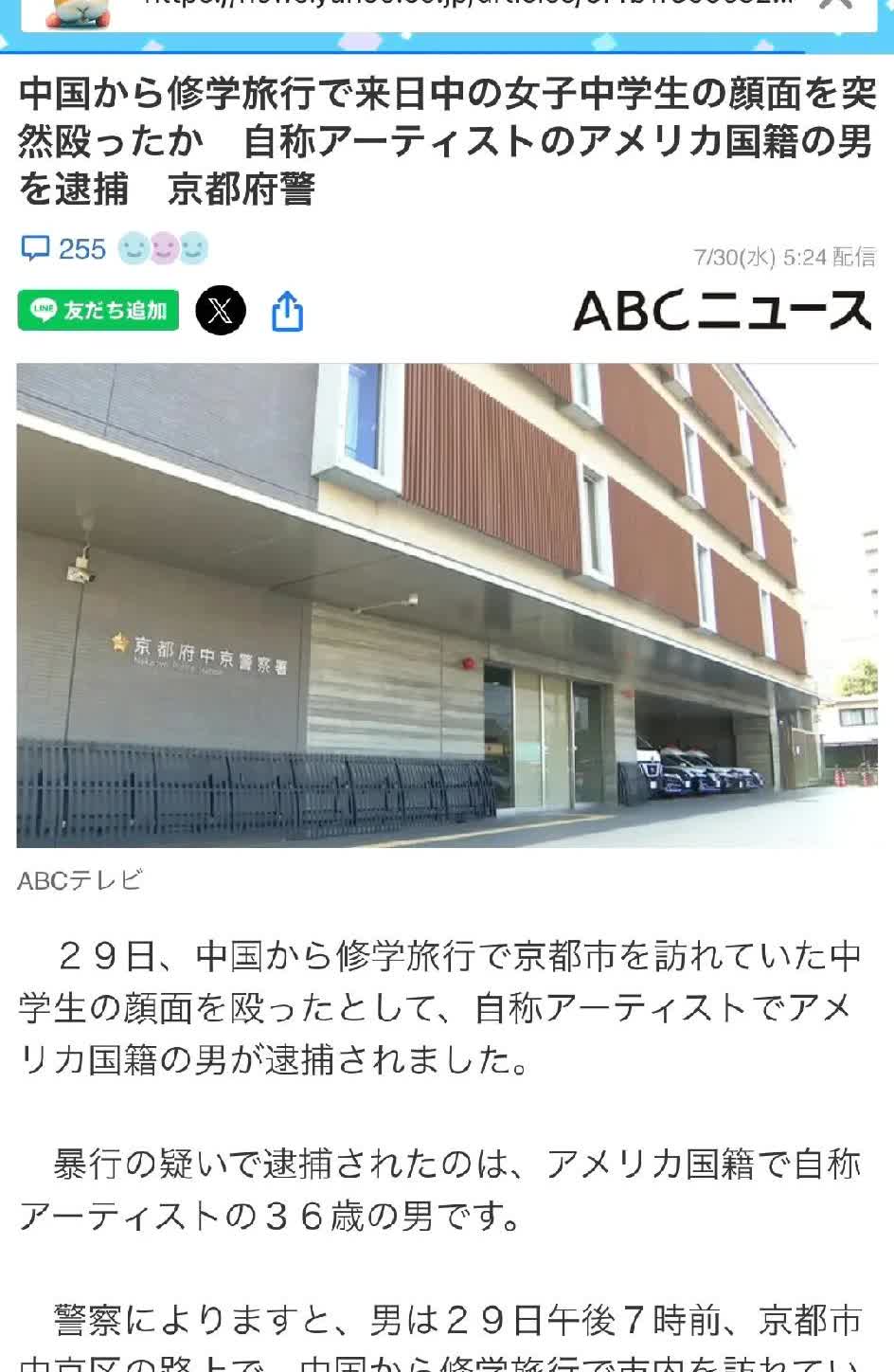前两天,一名美国人在日本街头突然袭击一名年仅13岁的中国女中学生,吓得日本人留言说不要在日本制造中美摩擦。 香港媒体报道:7月29日晚上7点左右,京都市中京区的街头上,一群来日本参加“研学旅行”的中国中学生正准备步行回酒店,正有说有笑往回走时,一名美国男子悄悄靠近队伍,突然跃起挥拳就向队伍里一名女生打去,这名13岁的女生冷不防,脸上就挨了一拳 莫名其妙挨了一拳的女生当场就愣住了,她身边的同学和老师也都吓了一跳。极其短暂的静止后,带队老师毫不犹豫第一时间冲上去,一起把这个美国人当场控制住,马上就有人打电话报警。 没一会儿,京都府警方就赶到了现场,将这个袭击女学生的美国男子带走调查,对与也就照常回到了酒店。 但是令人匪夷所思的是这个36岁美国人,他自称是“艺术家”,而且面对警方审讯时,他矢口否认自己曾经动手殴打女学生,毫无廉耻的说自己“什么都没做”。 这名13岁的女学生虽然身体强没有明显的伤害,但是心理冲击严重,据悉研学机构已启动心理干预。 日方警方以“暴行罪”对此事立案,但因现场无监控,而且施暴的美国人矢口否认,除了研学队伍之外,并没有目击证人到场,调查工作被迫陷入僵局。 此事一经爆出,就在日本当地引来不少不满,毕竟美国人在日本的地位是相当超凡脱俗,差不多都是横着走,尤其是驻日美军更是嚣张跋扈到了极致。 于是有日本人留言:请不要在日本进行中美摩擦。
