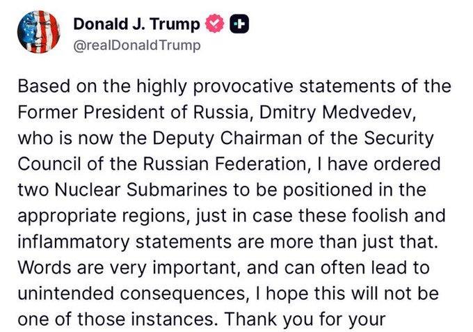 特朗普宣布他已部署了两艘核潜艇应对俄罗斯挑衅性言论 美国总统特朗普于2025年8月1日通过社交媒体宣布,为回应俄罗斯联邦安全委员会副主席梅德韦杰夫的"极具挑衅性言论",已下令将两艘核潜艇部署至"相应区域"。 此次行动直接针对梅德韦杰夫7月28日的警告言论,包括提及俄罗斯保留"苏联时期的终极核打击能力"及批评特朗普的"最后通牒游戏"。特朗普特别强调"言辞可能导致意外后果",但未说明潜艇具体型号及是否携带核武器。 路透社报道称潜艇被部署至"俄罗斯附近区域",但白宫未公布确切坐标。俄方暂未对此次部署作出官方回应。 此次事件是双方近期对抗的延续。特朗普7月28日缩短对俄最后通牒期限至8月8日。梅德韦杰夫讽刺性提及苏联"死手系统"(自动核反击系统)。特朗普回击称梅德韦杰夫为"失败的前总统"。 当前局势显示,美俄正通过核威慑姿态互相施压,但双方仍保持战略克制。