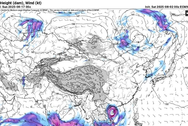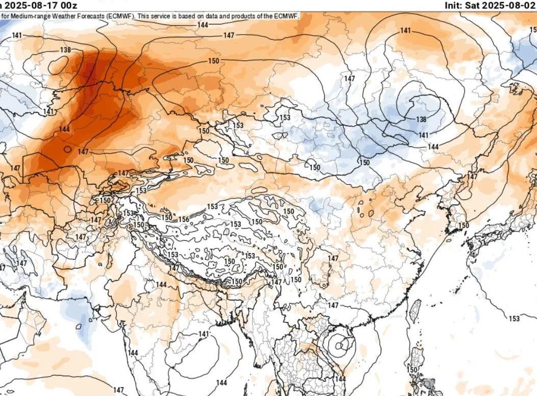 根据最新的15天数值预报。8月17日副热带高压不仅仅是控制了我国中部大部分地区