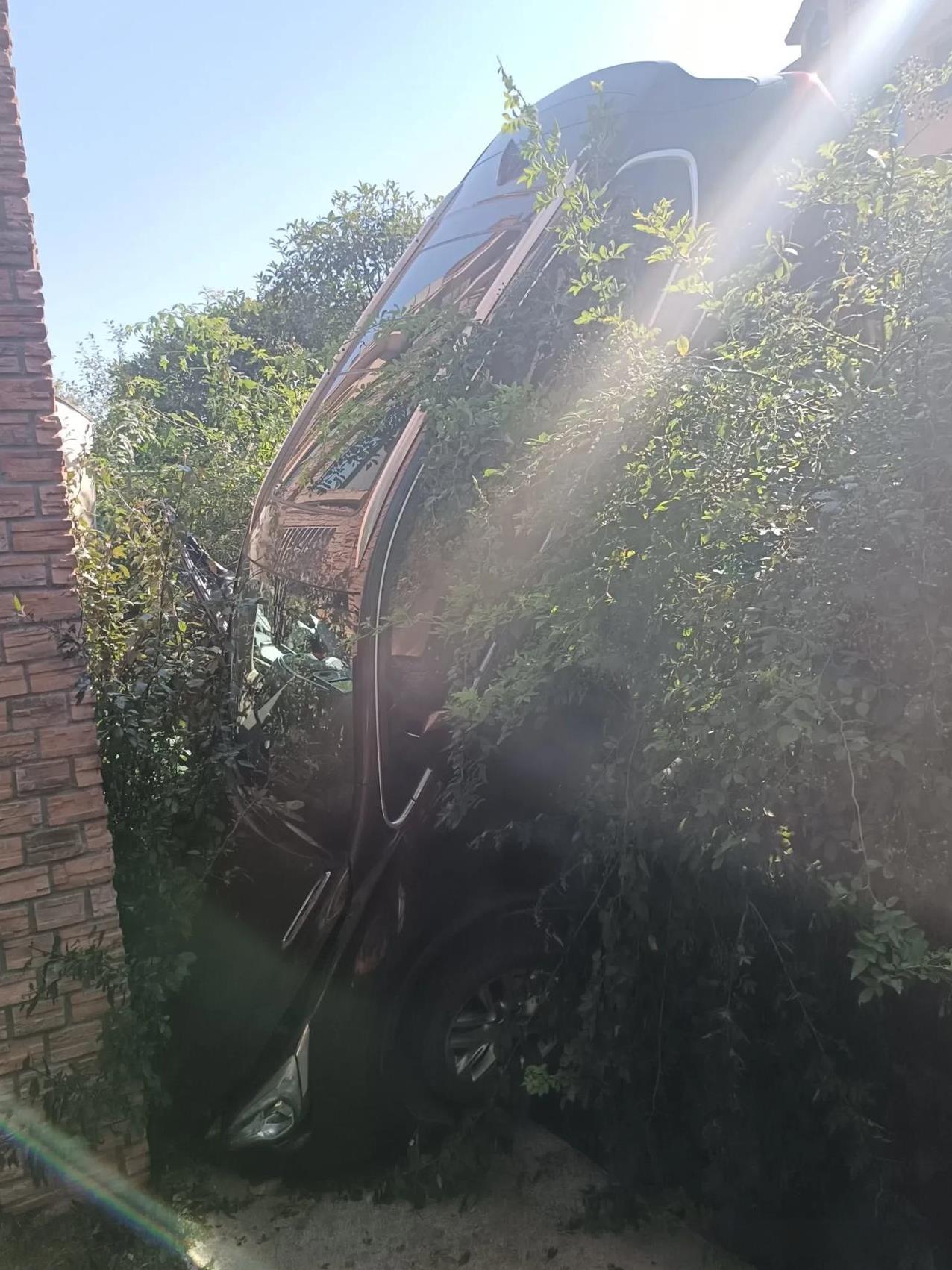 开车还是要小心 停车时 竟车头先入库 一脚油门 把车开到了保坎下边去了 幸好人没