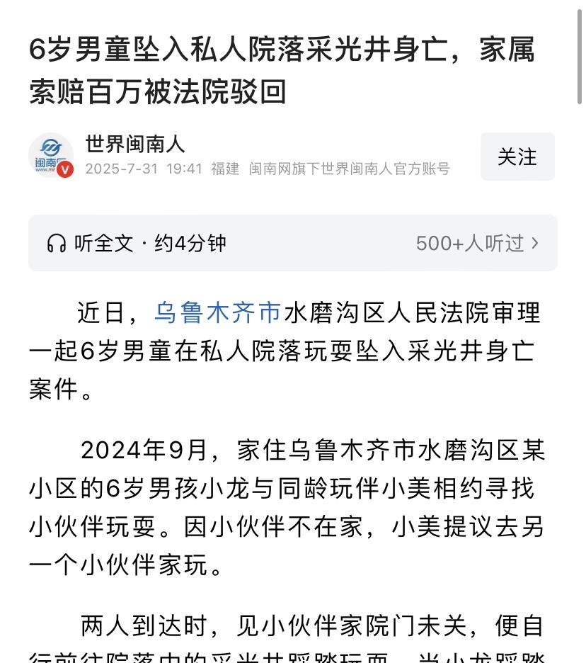新疆乌鲁木齐,2个6岁孩童去另一个小伙伴家里找他玩,见小伙伴家院门没关严,俩孩子就钻了进去,其中一孩子见有个采光井,踩上去蹦了几下,没成想,竟成缝隙掉下去坠亡了。孩子父母悲痛欲绝,认为房主没尽到安全保障义务,而另一个小孩也没及时提醒自家孩子危险,就把孩子2个玩伴的父母全部告上法庭,索赔100多万,而法院基于一个事实,驳回了父母的诉求。 据世界闽南人报道,2024年9月,6岁男孩小龙和邻居家同岁的女孩小美约着找人玩。他们先是跑到一个小朋友家没找着人,小美就说再去另一家看看。 俩娃娃溜达到那户人家时,瞧见院门没关严实,直接钻了进去。 院子里有个采光井,小孩觉着新奇,踩在上面蹦跶。谁知小龙刚踩了几脚,突然脚下一空,整个人从井盖缝隙里掉下去了。 这时候,屋主刘某正在3楼陪自家孩子,对院里发生的事完全不知情。机灵的小美赶紧用自己的电话手表联系妈妈。 小美妈妈一听情况不对,立刻通知了小龙家长。 等小龙妈妈疯跑过来哭喊着救人时,刘某才听见动静冲下楼。 只可惜,送医抢救也没能留住孩子,光医药费就花了8万多块,可谓是人财两空。 孩子的父母心如刀绞。他们觉得,刘某家私自改装了采光井,还没挂警示牌、没装护栏,这才害了孩子。 2025年开年,两口子把刘某和小美家都告到法院,要求两家共同赔偿医药费加损失总共100多万。 刘某对此满肚子委屈。他说院子是私人地盘,不是商场公园,围墙清清楚楚划着界限。 那个采光井根本就不是他家改的,整个小区都是这个统一设计,所有人家井盖都长一个样,上面明晃晃印着“禁止踩踏 当心坠落 儿童勿近”的大字。 他强调出事时家里根本没人,孩子是自己闯进来的,纯属意外。 刘某表示,事后自己还给他们献过血,垫过钱,该帮的都帮了。 小美父母也觉得冤枉,说这就是场意外,凭啥要我们赔? 那么,从法律角度来看,刘某和小美父母该不该赔? 《民法典》第1165条规定:行为人因过错侵害他人民事权益造成损害的,应当承担侵权责任。依照法律规定推定行为人有过错,其不能证明自己没有过错的,应当承担侵权责任。 法院审理发现,采光井确实是开发商统一造的,早就通过验收,刘某半块砖都没动过。 玻璃井盖微微倾斜的设计也是按图纸来的,完全合规。 法官表示,这家院子是私人住宅,和商场车站性质完全不同。法律没规定私人房主必须给不请自来的人做安全警示。 更何况,刘某既没敞着大门请人进来,也没动过采光井。 从法律要件看,构成过错侵权需满足“行为人存在过错”“过错与损害存在因果关系”两点。 刘某既未实施改造行为,即无主观过错,又已通过警示标识履行了合理范围内的安全提示义务,即客观上无过失,且事故发生时其未主动开放院落,孩子系自行闯入。 因此,刘某的行为不符合“过错侵权”的构成要件,不应承担侵权责任。 《民法典》第34条规定:监护人的职责是代理被监护人实施民事法律行为,保护被监护人的人身权利、财产权利以及其他合法权益等。监护人不履行监护职责或者侵害被监护人合法权益的,应当承担法律责任。 小龙年仅6岁,属于无民事行为能力人,其父母作为法定监护人负有全程看护义务。 事发时,小龙脱离监护人监管,与玩伴自行进入他人封闭院落并踩踏采光井,最终导致坠亡。 监护人未充分履行法定监护职责,是事故发生的直接原因之一。 判决重点提到两个关键:6岁的小龙根本不懂踩井盖多危险。出事时家长没在身边看着,让孩子脱离监护跑进封闭院落,这才是没尽到看护责任的根本。 至于小美,同样6岁的孩子约小伙伴玩再正常不过,她既没捣乱也没使坏,不应该让一个无过错的孩子担责。 根据法律对监护人责任的规定,监护人需对被监护人因脱离监管导致的损害承担责任。 本案中,小龙父母的监护失职与损害结果存在直接因果关系,其要求他人赔偿的诉求缺乏法律依据。 最终,法院驳回了孩子父母的全部诉讼请求。 不过,有人认为,这个小伙伴家存在两个过错:采光井在院里高处,本身就存在一种风险为什么不防护?二,采光井设计不规范,为什么有空隙缝漏下小孩子。采光井装修时留下能够漏下孩子的空隙缝干什么用的? 法律我不懂,安全隐患我懂一些。设计采光井,就该考虑到会有小孩贪玩儿去踩!而不是简单写名禁止踩踏,小孩哪儿懂这些。 也有人说,孩子没了,悲痛欲绝,可以理解,也应该同情。但以此向毫无责任的他人提出巨额赔偿,于理于法都是不应该的。 对于这件事,你怎么看? 欢迎关注@猫眼学法 #头号创作者激励计划#