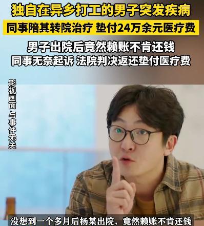 “太无耻!”江苏男子帮同事垫付24万元手术费,同事出院后,却不愿意还。同事觉得他属于工伤,男子应该找公司报销。可男子找到公司,公司却又不承认。为此,男子欠了一屁股债,不知道该找谁,法院的判决很解气! 据南昌晚报2024年12月8日报道,一场好心帮忙,最后竟然闹到打官司。 这事还得从几个月前说起,那天早上,天气特别冷,杨某和张某刚下完夜班。 没想到,杨某突然就捂着胸口倒地了,脸白得吓人,浑身冒冷汗。 张某当时哪还顾得上多想? 直接背着人冲下楼,把他送到医院。 医生检查完以后脸都变了:“主动脉夹层,非常危险,得立刻转大医院,不然随时可能没命!” 王先生第一时间打电话给杨某的媳妇,可她在老家,一时半会赶不过来。 医生又一直催:“耽误不得!” 那一刻,张某心里只剩一个念头:人命关天。 张某先拿出自己的积蓄,又赶紧四处借钱,硬是凑出24万,把张某从鬼门关拉了回来。 手术挺成功的,杨某命保住了。 后来杨某媳妇赶过来照顾,张某想着人都刚缓过来,也就没急着提钱的事。 可是没想到,这份好心,后来竟成了笑话。 几个月后,杨某康复回厂了,张某才开口说了句:“我那会儿给你垫了24万的医疗费……” 结果杨某立马翻脸,说了一句话把张某气得说不出话来:“我那是在宿舍发病的,是工伤啊,你要钱,找公司去。” 张某听了都傻了,他本来以为哥们情分在,不说感恩戴德,最起码不该装没事儿人吧? 可杨某竟然借工伤耍起了赖。 更离谱的是,杨某自己明明可以申请工伤赔偿,偏偏不动。 杨某想的也简单:只要他不出面,公司就不用赔,公司不赔,张某也拿不到钱。 而公司这边也摆得清:“你又不是患者本人,也不是家属,没资格申请。” 无奈之下,张某只能走法律这条路,把张某夫妇告上了法庭。 庭上,杨某和他媳妇还在那强词夺理,说张某是自愿垫付的,两人没借条,所以不算借钱。 但法院可没被糊弄。 虽然没签字画押,但张某那一摞缴费单,一张张都是真凭实据。 法官最后拍板:张某夫妻必须还这24万。 这事一出,网上炸锅了。 很多人说,杨某简直就是“现代版的农夫与蛇”。 有人感慨:“现在这个社会,行善一不小心,就可能掉坑里。 连救人都得怕被赖上。” 但还好,法律替王先生讨回了公道。 这件事你怎么看? 信源:南昌晚报