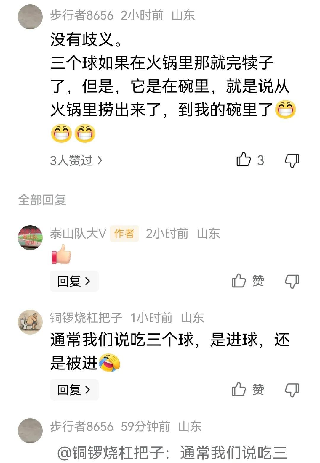 碗里三个丸子,证明这场比赛进三个球。肉片上两红一白,而成都主场球服为红色,山东客场球服为白色,成都2:1山东