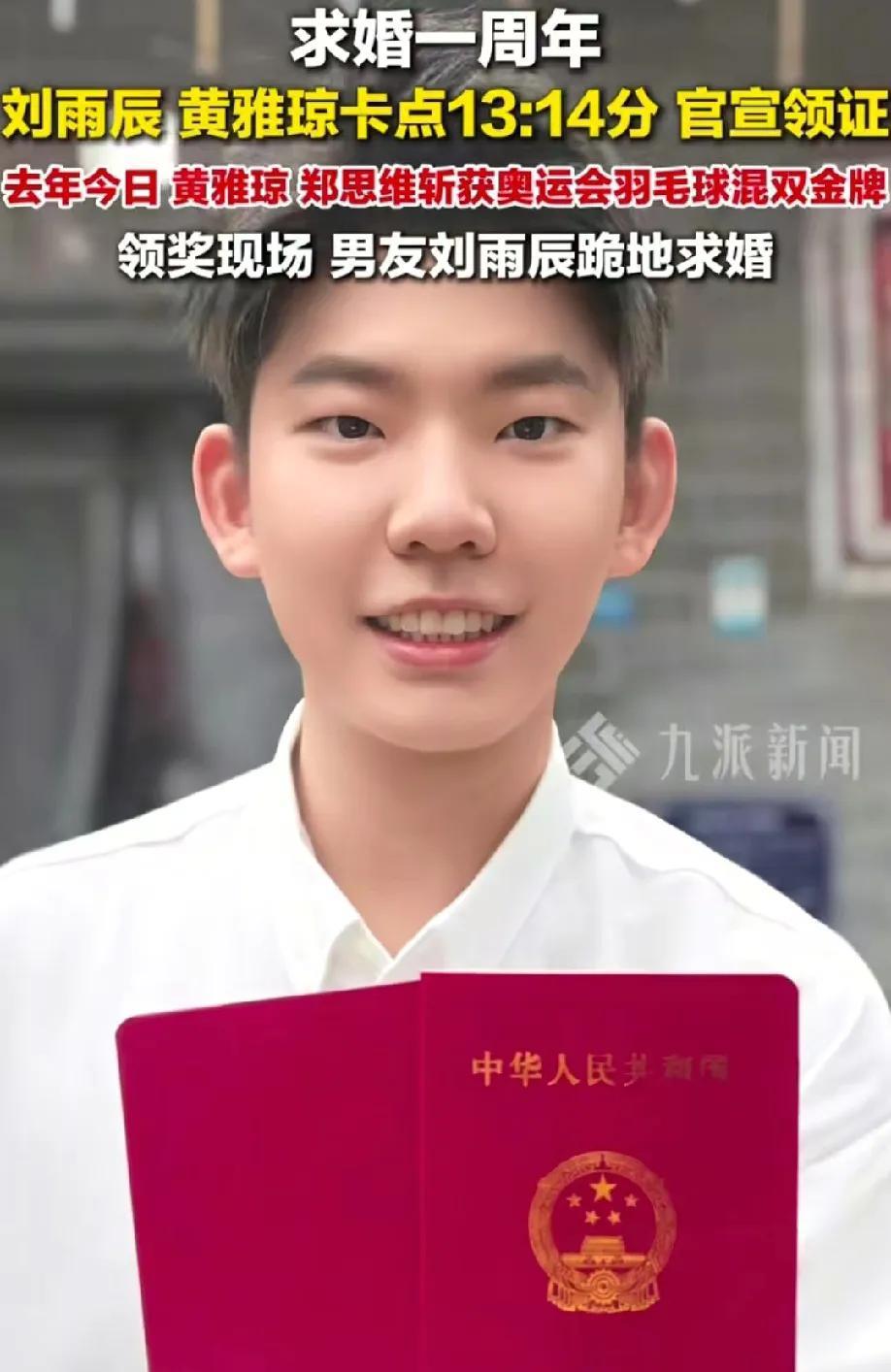 黄雅琼,刘雨辰13:14分官宣领征,去年今日刘雨辰在黄雅琼夺得羽毛球混双金牌现场,跪地求婚。 这两人是懂浪漫的,某人要学着点呀。 全世界见证了她俩一金,一钻,一吻的浪漫爱情。 祝福她俩天长地久,百年好合, 也希望在洛奥也能诞生一对新人[呲牙]