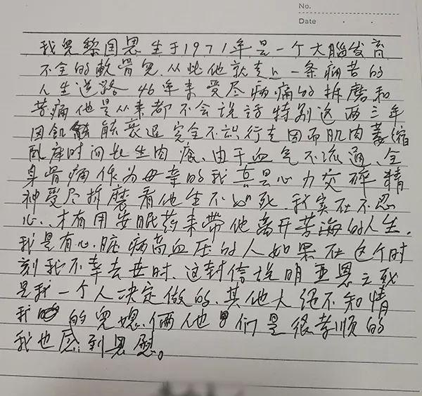 “我真的忍不了!”2017年,广州一83岁老太亲手喂儿子吃下70颗安眠药,并用丝巾将其勒死。等儿子死亡后,主动前往警局自首。审判时,得知真相的法官含泪作出判决。 在世界上,父母唯一无法接受的恐怕就是白发人送黑发人,毕竟亲眼看着怀胎10月才生下来的孩子离开,是一件无比痛心的事情。 但在2017年5月9日的下午,广东的王宛兰拿出一小瓶安眠药,并将瓶中的安眠药全部倒进碗中,随后又加上水和蜂蜜,将这碗可以称之为毒药的安眠药水全部喂给小儿子李建恩喝。 起初,李建恩以为母亲给自己弄了什么好东西,不料,喝了两口便觉得十分这碗水非常辣,不愿意再喝,听到小儿子不愿意喝,王宛兰也不恼,反而十分有耐心的哄着他将碗里的水全部喝下肚。 李建恩也在母亲的哄骗下,一口一口将这碗“毒水”喝的一干二净,看着因为药效起效而熟睡的儿子,王宛兰一改往日慈爱的面孔,不知从哪儿拿出一条丝巾,勒在他的脖子上不松手。 就这样,陷入熟睡的李建恩被母亲残忍杀死,但王宛兰看到儿子彻底死透后,瘫倒在床边放声大哭。 究竟是什么仇什么怨能让一名母亲,亲手杀死自己的孩子呢?她为何成功下手后,又放声痛哭呢?难道是后悔了? 原来,李建恩出生于1971年,当时已经37岁高龄的王宛兰看到儿子顺利出生,心中无比的欢喜,毕竟这十个月的艰辛只有自己知道。 起初李建恩的到来给这个家庭带来了许多的欢乐,但是随着时间的流逝,全家人发现他长得似乎比同龄人慢许多。 甚至缓慢到别的孩子学会走路了,李建恩却连翻身都不会,尽管这样家人依旧认为孩子只是发育缓慢,并没有多想。 直到李建恩5岁,他依旧不会说话,甚至连走路都不利索,王宛兰这时实在受不了了,便带着孩子前往医院检查,这一查不要紧,直接给李建恩下了最终诊断书。 原来,他并不是发育缓慢,而是唐氏综合征,当这一诊断被家人得知后,许多人都劝王宛兰把孩子送走,或者送到福利院。 毕竟这可不是小毛病,并且还是一个无法治愈的病,要是李建恩还留在家里,只会给家人拖后腿,说不定这个家会因为李建恩的存在而分崩离析。 但对于王宛兰来说,李建恩是从她身上掉下来的一块肉,不论孩子是怎样的,她都不会放弃。 于是,王宛兰开始带着孩子辗转各大医院求医,只为能让孩子回归正常。然而不论是哪里的医院,得出的结论都是孩子顶多到六七岁的智力。 无奈之下,王宛兰只能把孩子带回家照顾,为了能够更好的照顾他,王宛兰甚至提前退休,专心在家照顾儿子。 但我们都知道,王宛兰不可能陪在李建恩身边一辈子,随着时间的推移,王宛兰越来越老,李建恩的智力却丝毫没有长进,反而由于母亲常年在身边,所以只要王宛兰离开一小会,他就会紧张大叫。 更让人绝望的是,到了2001年,30岁的李建恩直接瘫痪在床,失去了自理能力,也就是说他变得跟植物人没有区别。 到了2017年已经83岁高龄的王宛兰身体开始频繁出现问题,甚至还检查出了心脏病,这让她感到自己时日无多,但瘫痪在床的儿子怎么办呢? 王宛兰不愿将小儿子这座大山留给大儿子,也不愿让李建恩在福利院或养老院苟延残喘,在深思熟虑下,王宛兰决定提前结束他的这一生。 2017年王宛兰多次以睡眠障碍为由,在社区开安眠药后,偷偷藏在钙片的瓶子里,甚至还专门用一张纸写下一封绝笔书。 信中的内容充满了她的苦楚:我儿李建恩生于1971年,46年来,受尽疾病的折磨和苦痛。作为母亲的我,实在不忍心,只好用安眠药带他离开苦海人生。 准备好一切后,王宛兰让大儿子先去吃饭,自己留在小儿子身边,忍痛将李建恩杀死。事后,她在大儿子的陪同下,前往警局自首。 当街坊邻居和亲戚们得知王宛兰的所作所为后,不仅没有感到愤怒,反而纷纷给法院写信求情。 参考资料: 广东83岁老母含泪杀子,判决下来了,旁听席沸腾了……——广东共青团2017-11-09