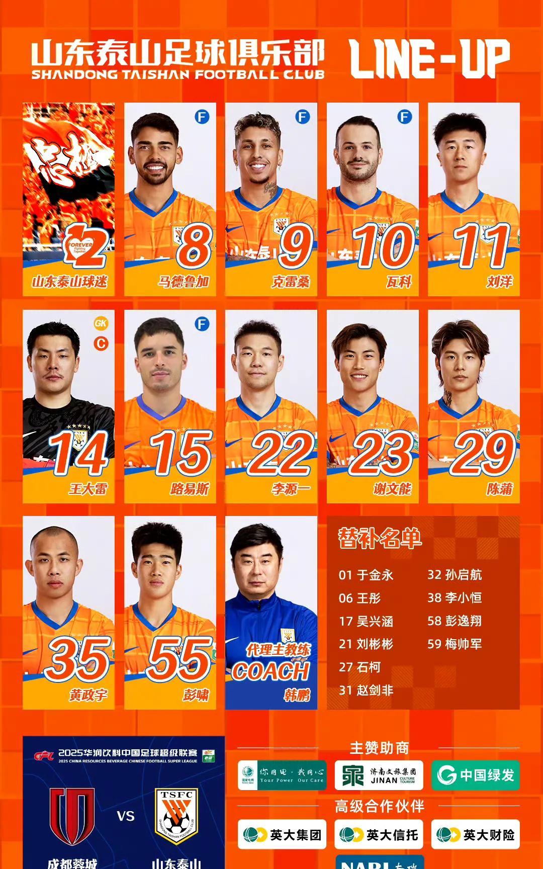 山东泰山对阵成都蓉城今日首发,刘洋,洛佩斯,彭潇,谢文能,黄政宇,李源一,马德鲁