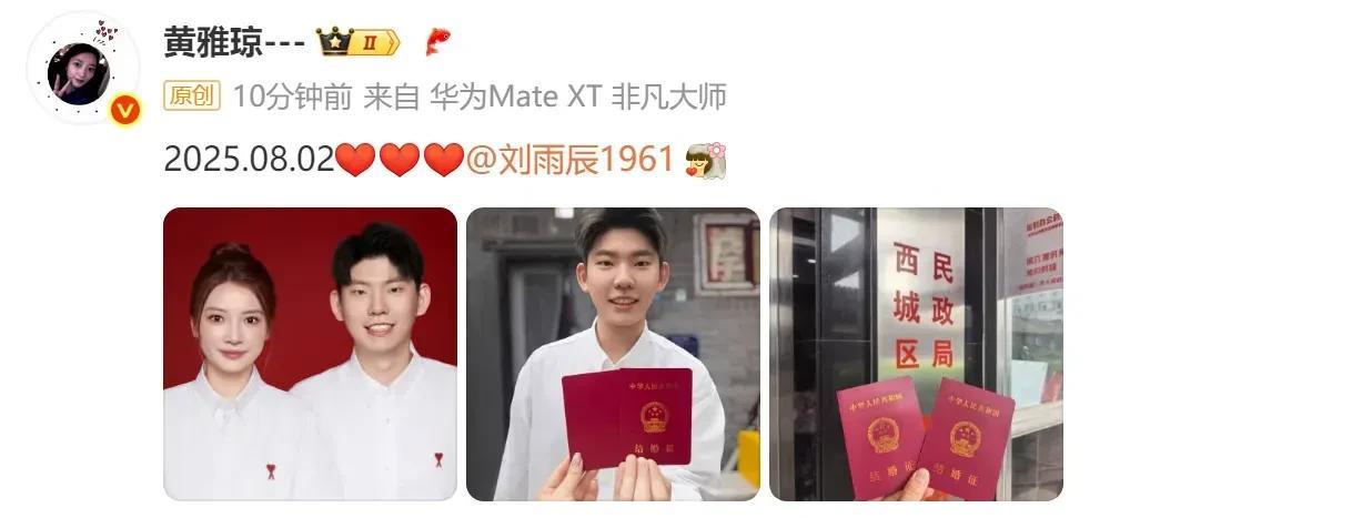 恭喜!他们宣布领证!结婚照曝光 8月2日,黄雅琼与刘雨辰13:14晒照官宣领证结