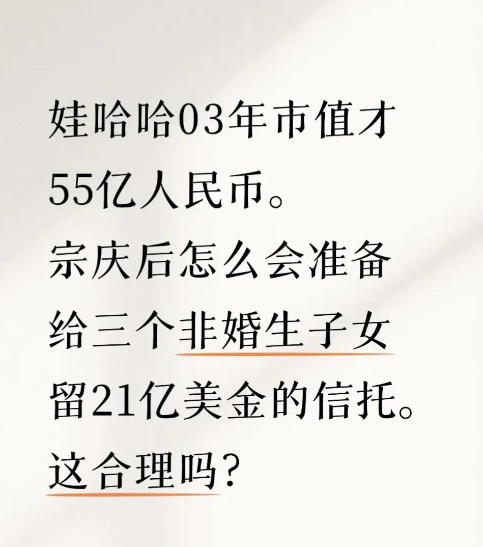 宗庆后03年就成立信托资产,原计划是21亿美金(03年大概是173亿人民币),到