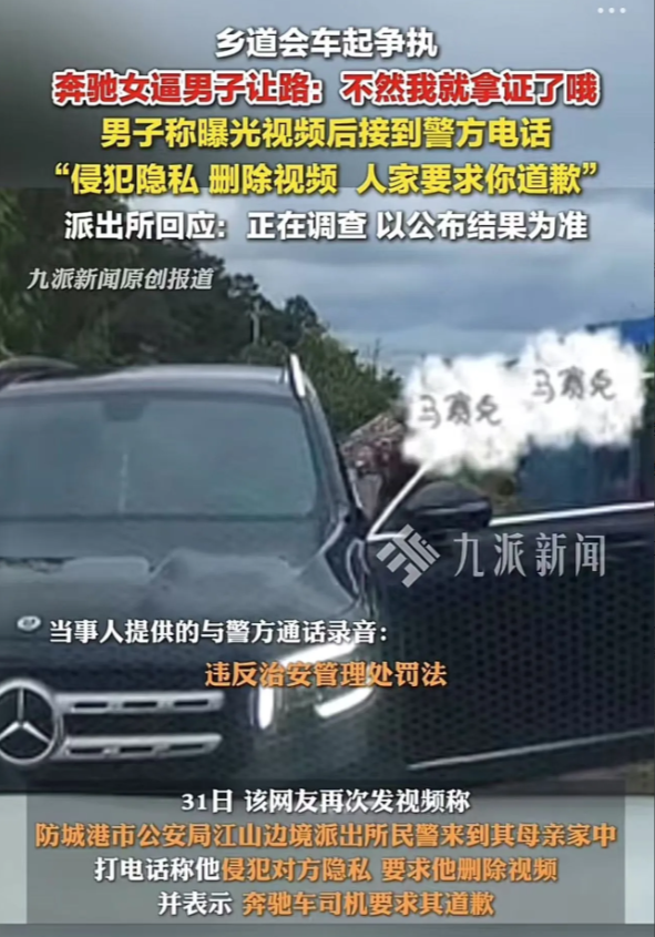 “亮证姐”太嚣张了!广西防城港,因为会车起争执,奔驰女司机竟然亮证逼白车男子让路。男子不让,奔驰女司机竟然爆出男子的姓氏和家庭住址威胁!更让人瞠目结舌的是,民警上门让男子删视频,最后道歉的居然是男子!网友:这女的到底什么身份?