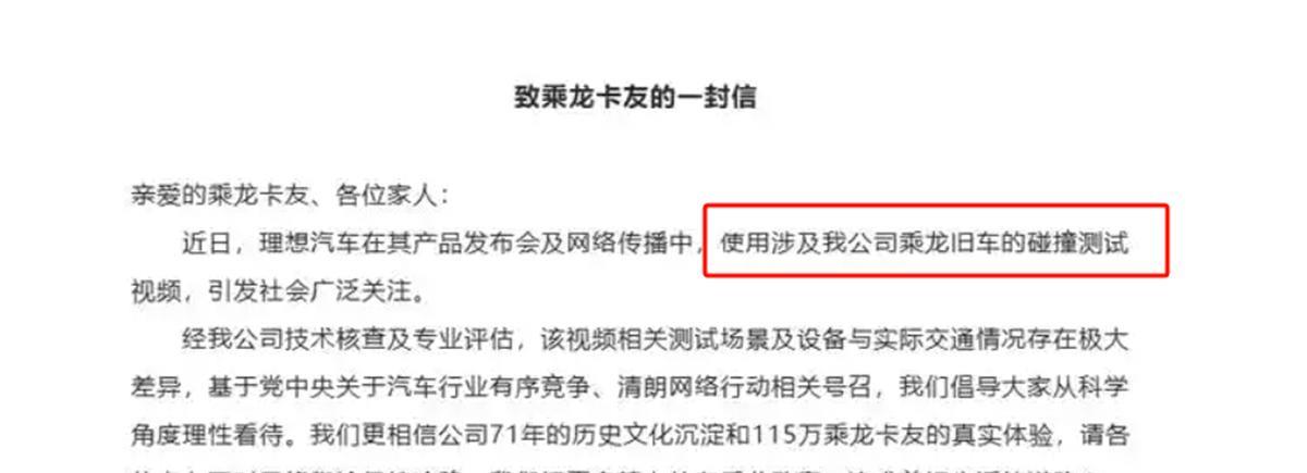 乘龙卡车再发声! 继此前发布公告之后,8月2日,乘龙卡车方面再度发声,首先是发布了一个海报并配文:活着,才有资格谈理想,另外就是发布了一个《致乘龙卡友的一封信》,《致乘龙卡友的一封信》中提及,“使用涉及我公司乘龙旧车的碰撞测试视频”,这句话的重点显然是“旧车”。 另外值得注意的是,专注商用车的媒体账号“提加商用车网”今天也发布了一条信息,信息中标表示,根据碰撞测试视频中的细节推断,测试车是一辆国四排放的老款乘龙M3,车龄接近10年。这一点也是和乘龙卡车最新发声中提及的“乘龙旧车”相吻合的。 如果确定此次碰撞测试中的乘龙卡车并不是使用的全新车,那么这一台老车又会有着怎样的具体车况呢?