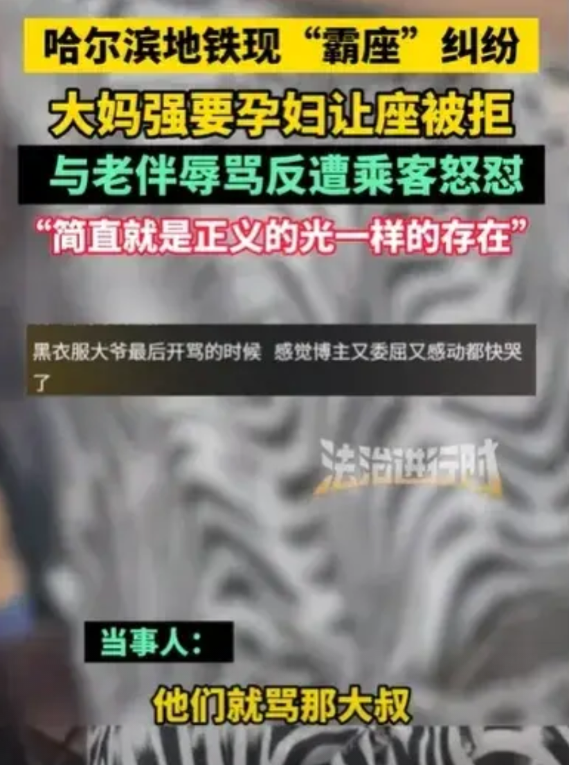 黑龙江哈尔滨,女子怀孕了,坐地铁时,正好有位置,结果上来了一对大妈大爷,大妈要怀孕女子让座,女子说自己怀孕了不能让,大妈就骂女子,旁边的人看不下去,就给大妈让座了,结果那位大爷心里不舒坦了,就站在一旁骂怀孕女子,女子很委屈,就在这时,一个正义的声音出现了。