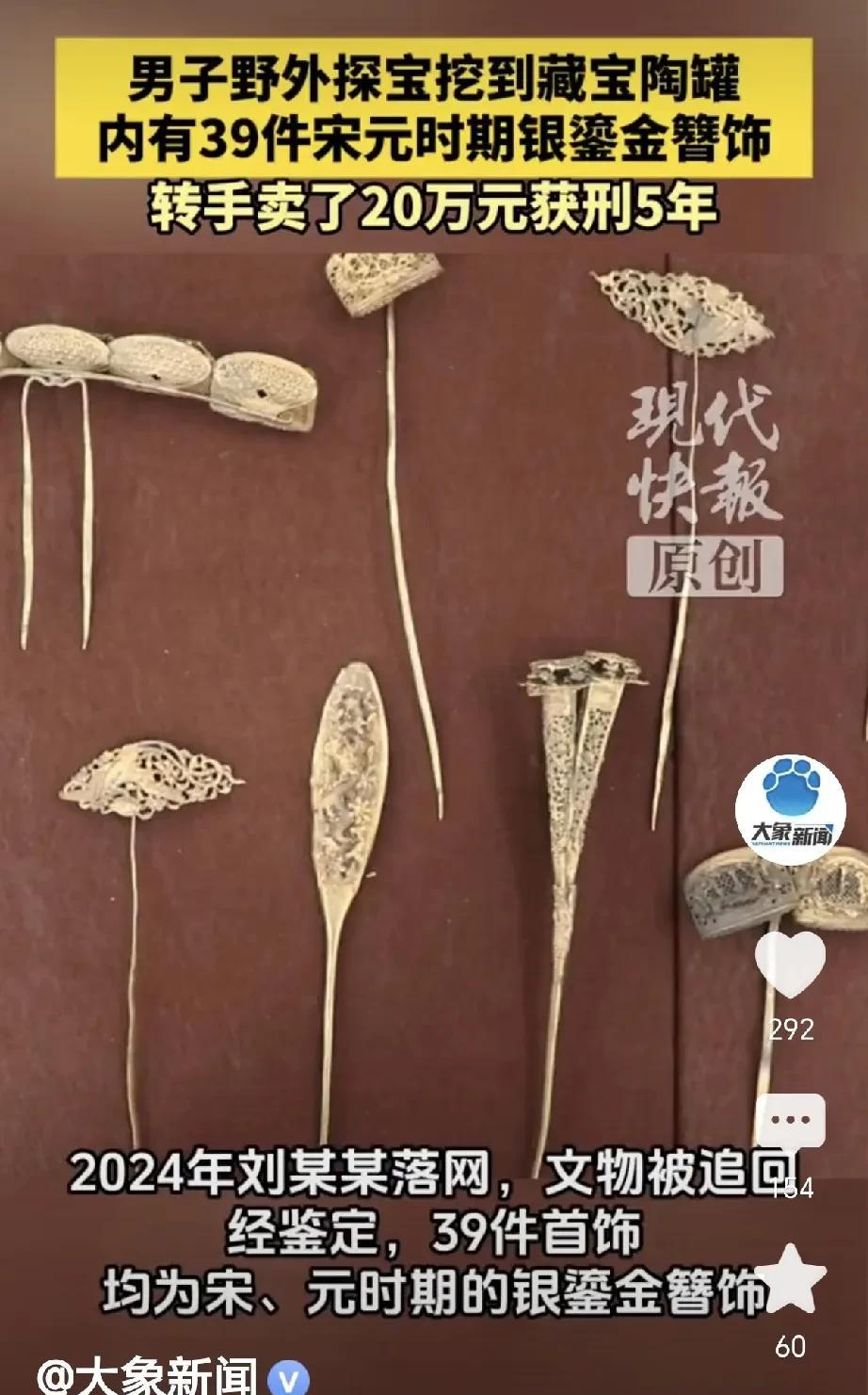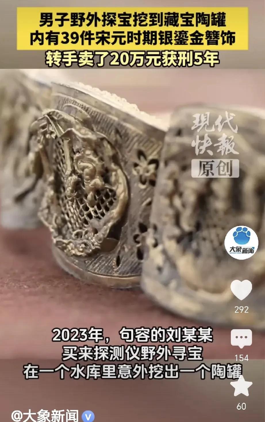 偷鸡不成蚀把米!江苏句容,一男子刷短视频,看到有人野外探宝,他受到启示,立刻花1000元网购了探测仪,他到村边干涸水库,用探测仪一探,突然发出滴滴滴,他几铲子下去,挖出来一个陶罐,砸烂一看,里面有39件金晃晃的首饰,狂喜之后,他打包卖出,获得20万元,给中间人好处费1.88万,可是,他没有想到,这39件首饰是宋元时期的文物,4件二级、6件三级,其余属于普通文物,钱还没有捂热,警方找上门来,男子悲剧了。 2025年8月1日,据大象视频报道,一男子挖到文物私自卖了20万元,被抓获后提起公诉。 刘某某生在农村,可是,他聪明伶俐,不甘心就这么贫穷下去。 他自命不凡,一直都在寻找发财的机会,他闲暇无事,刷着手机短视频,他突然停下,反复的看了几遍。 短视频上,一位博主,拿着一个金属探测仪,在荒野中探宝,探测仪时不时的发出尖锐的提示音。 可是,探出来的东西,都是废铜烂铁,也没看见有什么好的东西。 尽管如此,刘某某还是非常感兴趣,他受到了启发,立刻在网购平台上下单,花了1000元,买了个探测仪。 没过几天,探测仪就寄到了手里,研究之后,他就拿着先在家门口测试。 几番测试下来,探测仪灵敏无比,就和探宝视频里显示的一模一样,一旦发现东西,就会滴滴滴响个不停。 于是,他慢慢开始扩展探测的领地,他怕别人知道,开始的时候,只敢在村口的荒地里探测。 可是,找了很久,找到的只是一堆废品,破烂一堆,根本就没有所谓的宝贝。 他心里失望,又不甘心,没事就在心里琢磨,哪里可能会有值钱的东西。 过了一阵,到了枯水季,到处都是干涸,就连村旁边的公园水库里,都是只剩下了裂开的淤泥。 刘某某脑子一转,仿佛得到了一个提示,他心琢磨,这淤泥下面,会不会藏着值钱的东西? 他说干就干,趁着四周无人,立刻拿着探测仪在里面地毯式寻找,没过一会,探测仪突然发出滴滴滴的提示。 刘某某拿出铁铲,费劲的挖开上面的淤泥。 果然是功夫不负有心人,随着一铲铲的下去,碰到一个硬物,淤泥下埋着一个陶罐,因为年代久远,上面已经长满了青苔。 他心里狂喜,抱着陶罐就回到了家里,举起锄把,将陶罐砸烂,哗啦一声,散落出来一堆金灿灿的首饰。 刘某某眼前发亮,可算是找到了宝贝,他细数一遍,一共有39件首饰。 他小心藏了起来,随后,就开始四处询问,这样的首饰能卖多钱。 他在某地古玩市场,认识过一个中介沈某某,刘某某联系上他之后,两人认为,这些宝贝,绝不能让别人看到,不能见光,要赶紧卖掉。 随后,沈某某联系到买家王某某,告诉他说,有一位卖家,要出售家传宝贝。 2023年8月某天,沈某某带刘某某和王某某见面,王某某花了20万元,将39件首饰全部买走。 刘某某狂喜不已,这么容易就发了横财,他按照约定,支付了18800万元给沈某某当做好处费。 可是,刘某某没有想到,20万揣到兜里,还没有暖热,2024年2月,警方就找到了刘某某的家里。 刘某某傻了,他没有想到,自己已经触犯了法律,被警方逮捕,沈某某得到消息,他害怕了,主动到警方投案自首。 随后,39件首饰,被警方悉数找回。 经过鉴定,这39件首饰,全是宋元时期的文物,全名叫做银鎏金簪饰。 在39件首饰当中,4件属于二级文物、6件属于三级文物。 除此之外,包括装首饰的陶罐,均为一般的文物。 到了2024年12月,此案件被警方移送到检察机关。 检察机关的工作人员和警方一起赶到了案发现场,使用无人机进行了勘查。 工作人员需要搞清楚,挖掘地到底是古墓葬,还是古文化遗址,还是偶然发现的普通地点,这样才能确定刘某某是否构成了盗掘古墓葬罪。 经过对比分析,刘某某被确定为涉嫌倒卖文物罪,7月25日,刘某某被检察机关提起公诉。 那么,这件事在法律上是怎么认定的呢? 《刑法》第326条规定:以牟利为目的,倒卖禁止经营的文物,情节严重的,处五年以下有期徒刑或者拘役,并处罚金;情节特别严重的,处五年以上十年以下有期徒刑,并处罚金。 刘某某私自挖掘并倒卖宋元时期二级文物4件、三级文物6件,属于禁止经营的文物。 根据《最高院关于审理倒卖文物犯罪案件具体应用法律若干问题的解释》,倒卖三级文物3件以上或二级文物1件以上即构成“情节严重”。 本案中,刘某某倒卖的文物数量和等级远超标准,且获利20万元,符合“情节严重”情形。 刘某某通过中间人沈某某完成交易,主观上具有直接故意,客观上实施了倒卖行为。 最终,法院做出判决,以倒卖文物罪判处刘某某有期徒刑5年、罚款3万元。 沈某某作为中间人,协助联系买家并收取好处费,属于共犯,判处有期徒刑3年,缓刑4年,罚款10000元。 对此,你怎么看?欢迎评论区留言讨论。 关注 @王哥说法 看人间百态,学法律知识。#头号创作者激励计划#