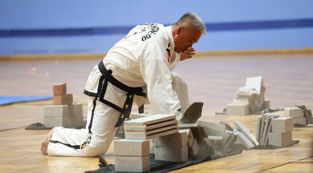 跆拳道人的拳头 朝鲜跆拳道委员会师贤金明俊多次在国内外比赛上进行示范表演,显示强大的手综合威力,被人称为铁拳汉子。