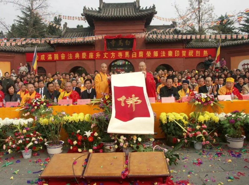 当年白马寺方丈升座时,中国佛教协会常务副会长圣辉法师向法会展示了赵朴初会长的金字
