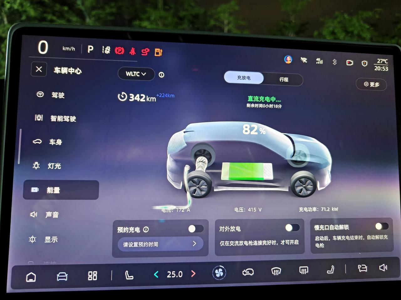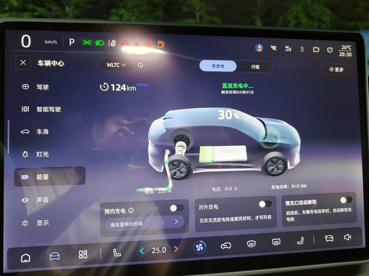 S05开到现在已经快5000km了,今天才第一次实际看一下他的充电速度。 看官方宣传说这辆车搭载了3c速率的充电功率,今天来实测一下。 路边转了很久,找了一个120kW的充电桩,不过旁边还有车在充电,所以功率没有办法跑满。 充电功率最高只跑到90kW,实测从30%充到80%使用了20分钟左右,全部充满,用了大概半个小时,这个充电速度我还是很满意的。 如果是在长途用车途中,基本上上个厕所或者吃个饭就充满了,这个速度还是很满意的。