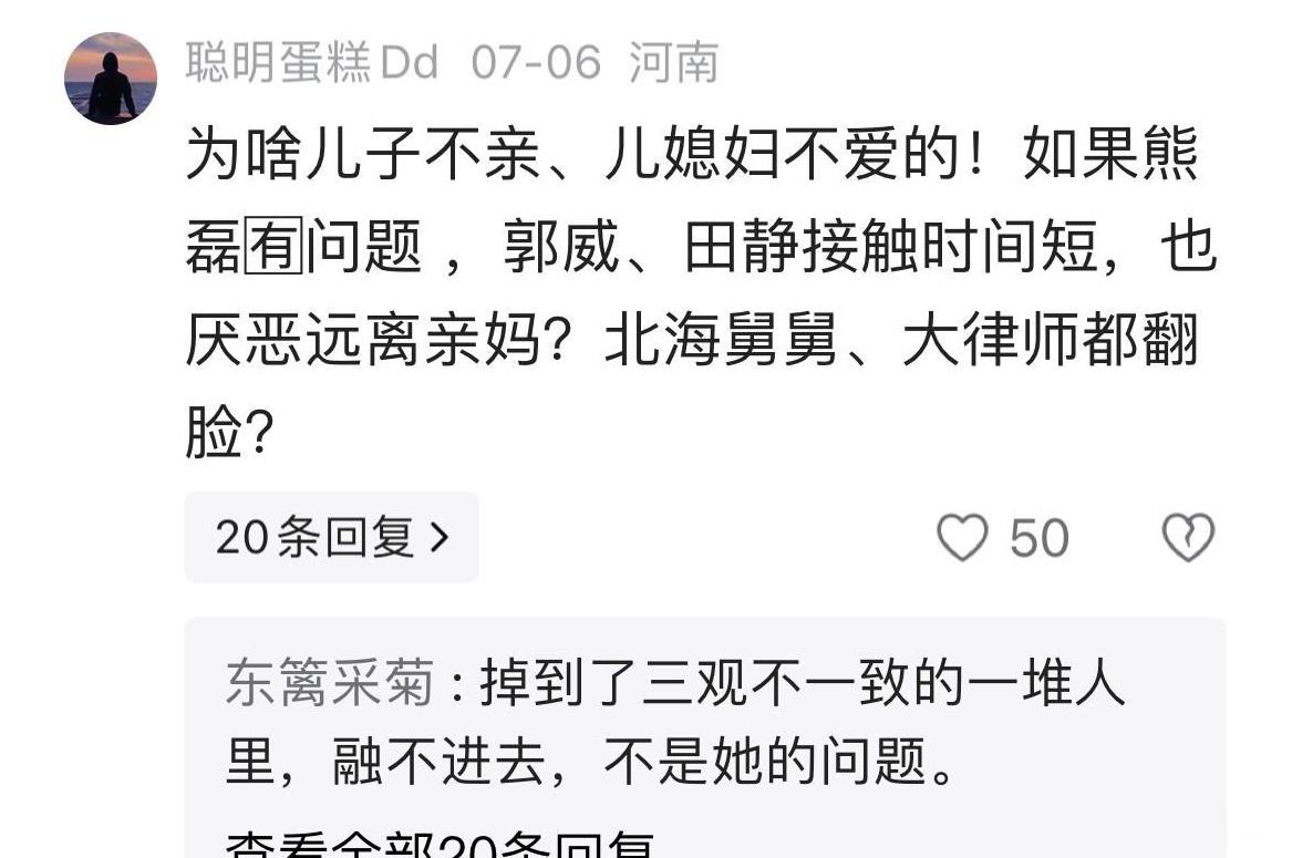 一个叫“聪明蛋糕”的一段话,“为啥儿子不亲、儿媳妇不爱,如果熊磊有问题,郭威、田静接触时间短,也远离亲妈?北海舅舅、大律师为什么都跟许敏翻脸?” 这件事不是一般的家庭琐事,不能片面的看问题。人缘好的人不一定人品好,人缘不好的人,她绝对是个好人。 谁阻拦查真相,换了谁都会拒绝交往,在大是大非面前,没有什么情面可讲。 许敏的问题就是太善良,不长心眼。如果当初孩子查出乙肝时,她要是去跟医生了解乙肝病毒是怎么感染的,是不是有遗传的情况,或许她今天就不会那么被动。#许妈田威矛盾#
