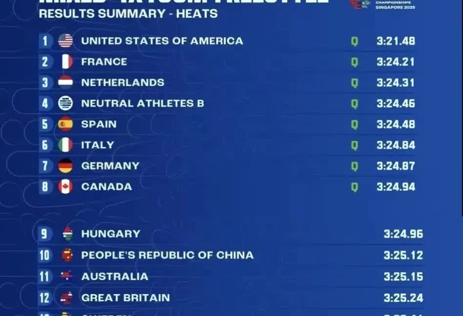 新加坡世锦赛男女混合4×100米自由泳接力预赛,中国队没有派出主力,可能是对于进入决赛比较有信心,准备将最强组合潘展乐、汪顺、吴卿风、程玉洁留在决赛,结果,由陈俊儿、王浩宇、余依婷、杨雯文组成的这套阵容仅获得小组组第5、综合排名第10,无缘今晚的决赛,其中,其他三棒成绩尚可,但只参加接力比赛的杨雯文只游出了54秒53,导致最终排名靠后。