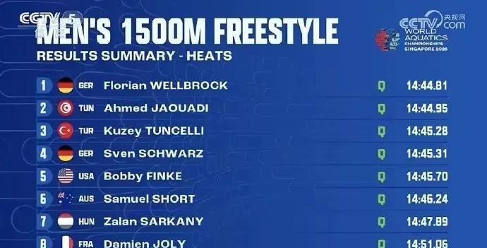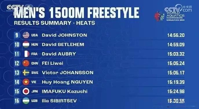 新加坡游泳世锦赛男子1500米自由泳预赛,费立纬在第二组登场,以15分05秒24