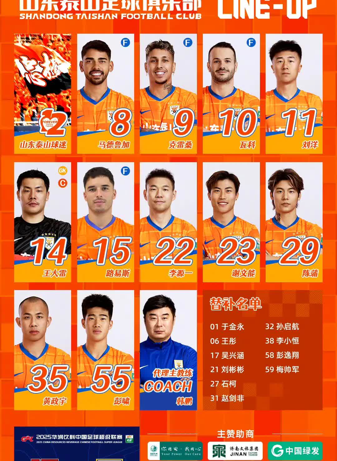 山东泰山对阵成都蓉城今日首发,刘洋,洛佩斯,彭潇,谢文能,黄政宇,李源一,马德鲁