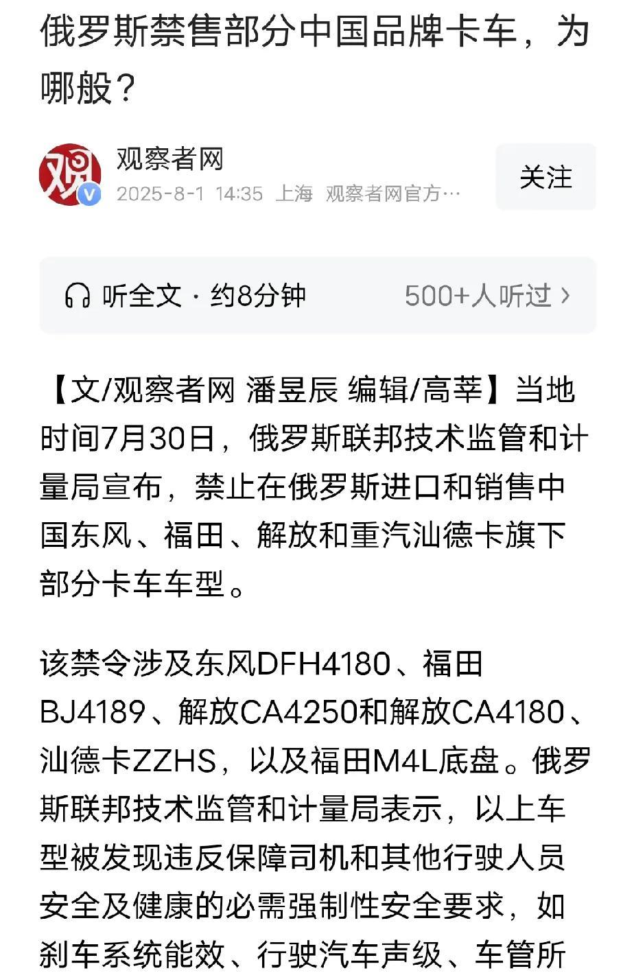 7月30日,俄罗斯宣布:禁售部分中国品牌卡车。 7月31日,中俄在海参崴联合军事