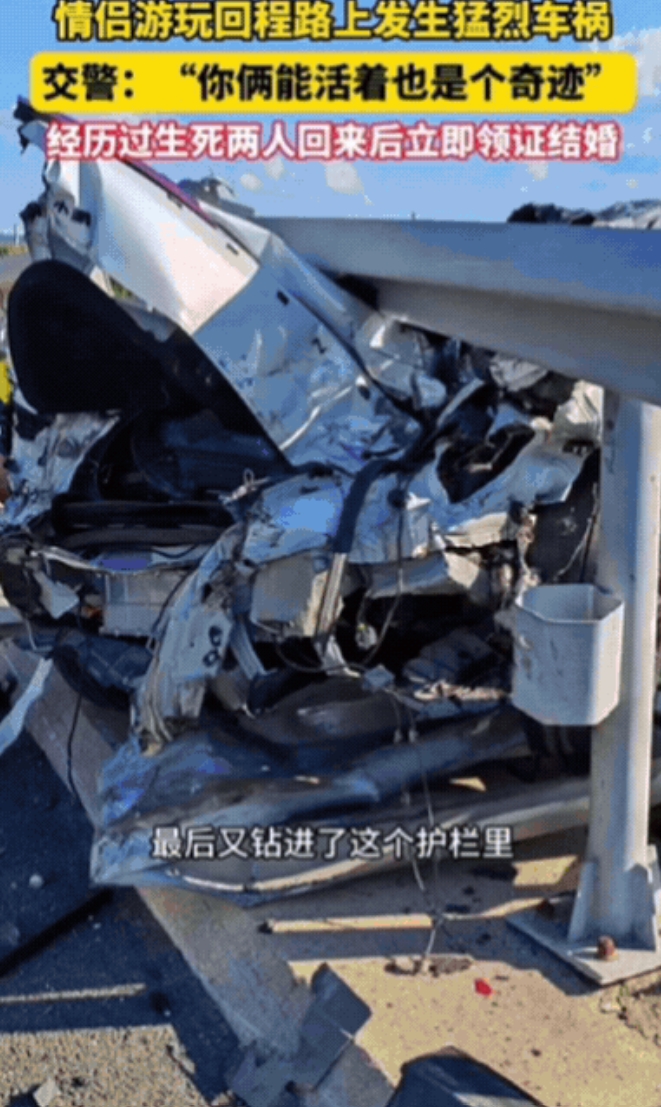 “大难不死必有后福!”山西太原,一对情侣旅游回来途中,发生猛烈车祸,车基本挤扁了,整个车已经变形不成样子,然而,2人却只是受了点皮外伤!连交警都震惊了:你们俩能活着也是个奇迹!经历过生死,两人回来后立即领了证结婚,网友:同生共死,这也算是生死之交了!