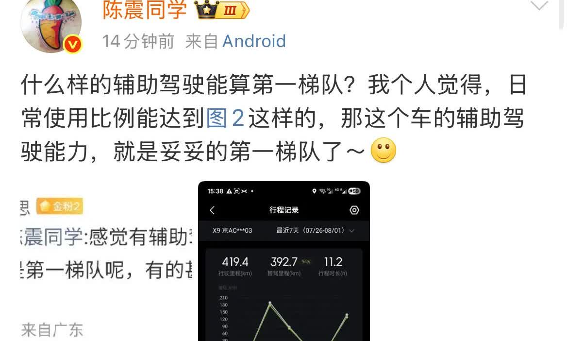 陈震解释什么样的辅助驾驶,能算第一梯队? 陈震今天下午在社交网络放出了一