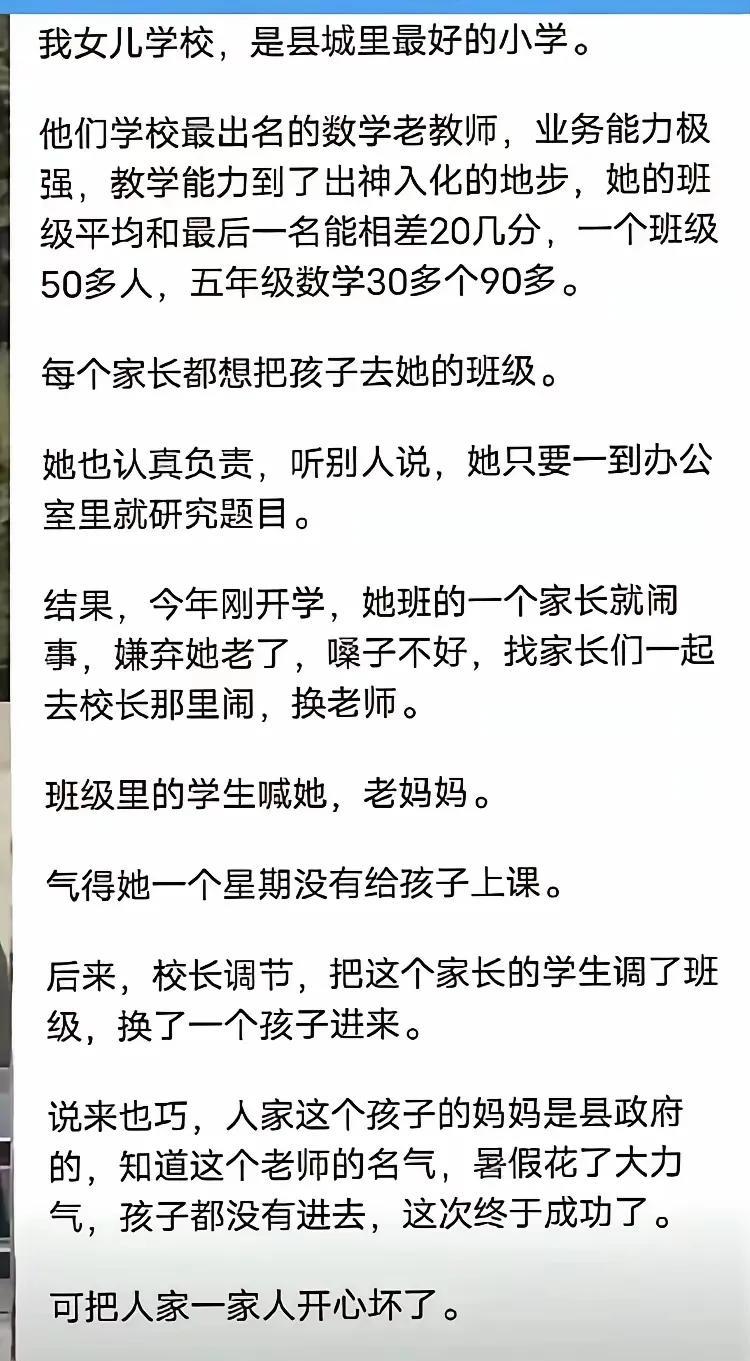 就是有那种sb家长,我儿子班主任也是,很好的老师,结果被告,带不了了,换班主任,只是不知道谁干的,真想骂死他。