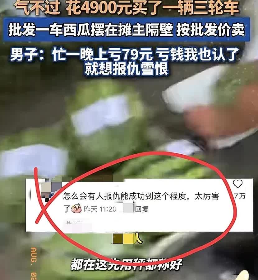 江苏南京发生了件超奇葩的事儿!一男子在西瓜摊问价,就因担心秤不准没买,摊主竟然不依不饶,追着他足足骂了一小时! 男子气炸了,大手一挥花4900元买了电动三轮车,批发来一车西瓜,就在隔壁按批发价卖!忙活到晚上一算账亏了79元。网友劝他涨点价,男子表示就想报仇雪恨,啥都没考虑。 这男子的做法虽说能理解他被骂后的气愤,但为了报复亏本卖瓜,实在不划算,遇到这类矛盾,咱们是否可以有更智慧的处理方式?既解决问题又不委屈自己。 要是你碰到这事儿,会像这位大哥一样冲动“回击”,还是另有高招?快来评论区聊聊呗!