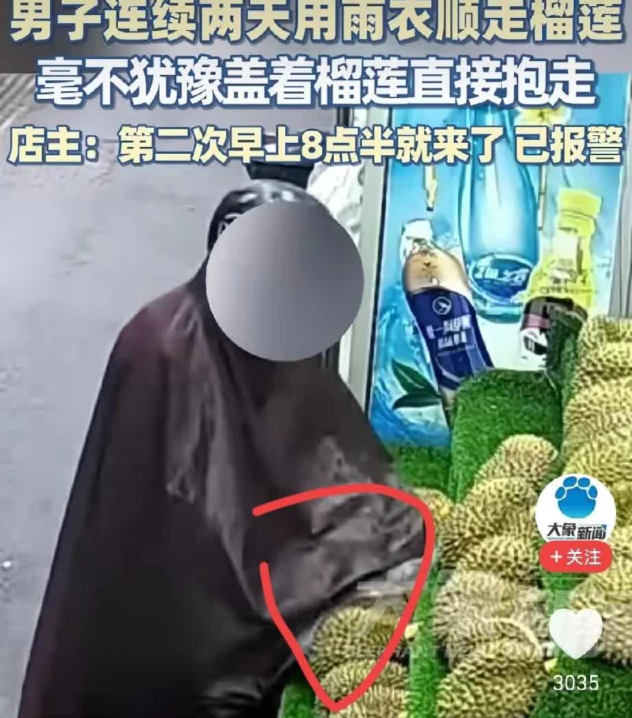 江苏一名男子,连续两天去同一家水果店偷榴莲,第一次是在白天穿着雨衣,先是用雨衣盖