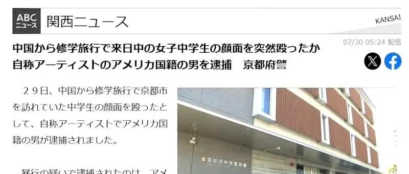 什么勾八东西啊 港媒消息:7月29日晚上7点左右,京都市中京区的街头上,一群来自中国的中学生来日本参加“研学旅行”,正在老师带领下步行回酒店。队伍里有一个13岁的女生,正和大家一起走着,突然,一名男子靠近队伍,毫无预兆地挥拳打在这名女生脸上。 女生被打得当场愣住了,身边的同学和老师也都吓了一跳。带队老师第一时间冲上去,把这名男子按住,现场有人报警。 很快,京都府警方赶到现场,将男子带走调查。这个自称“艺术家”的36岁美国人面对警方时否认动手,说自己“什么都没做”。