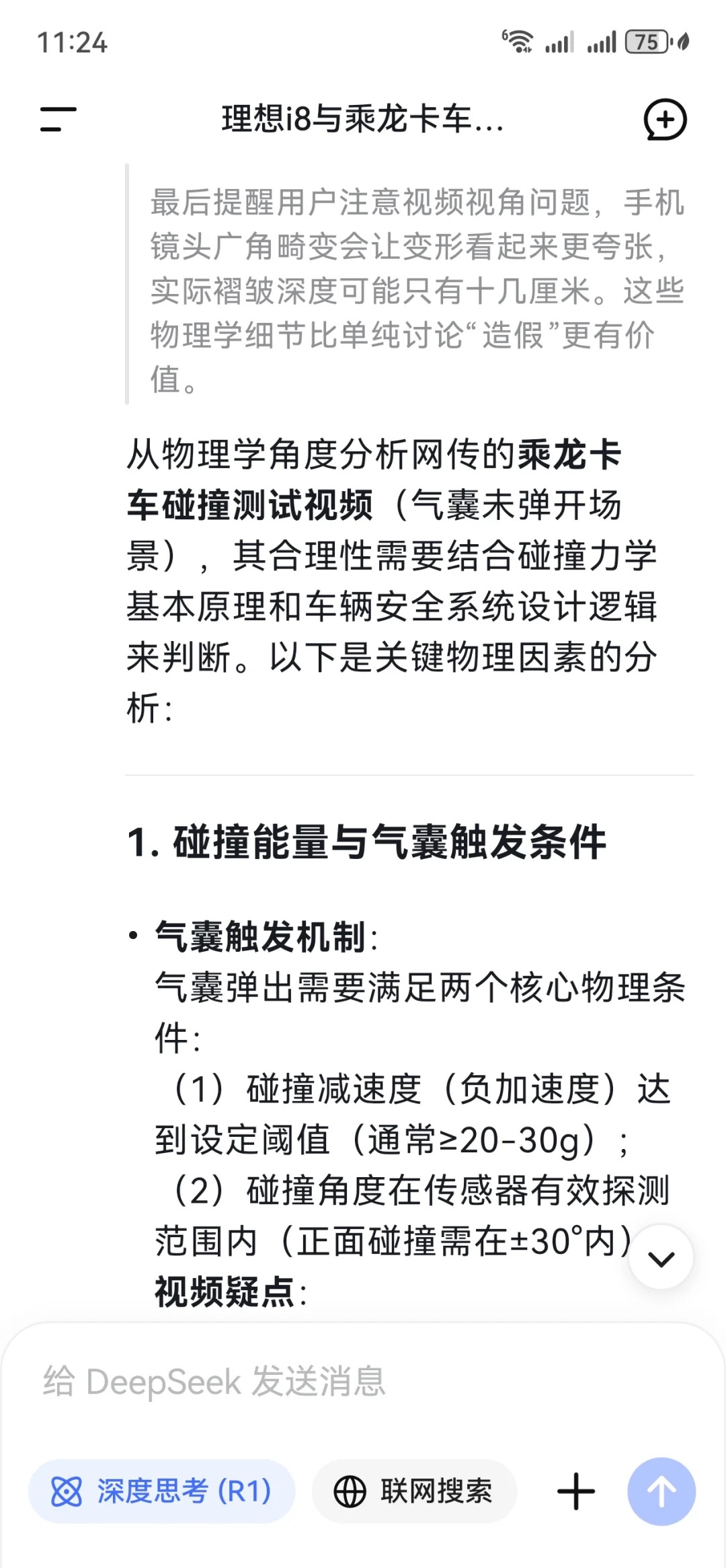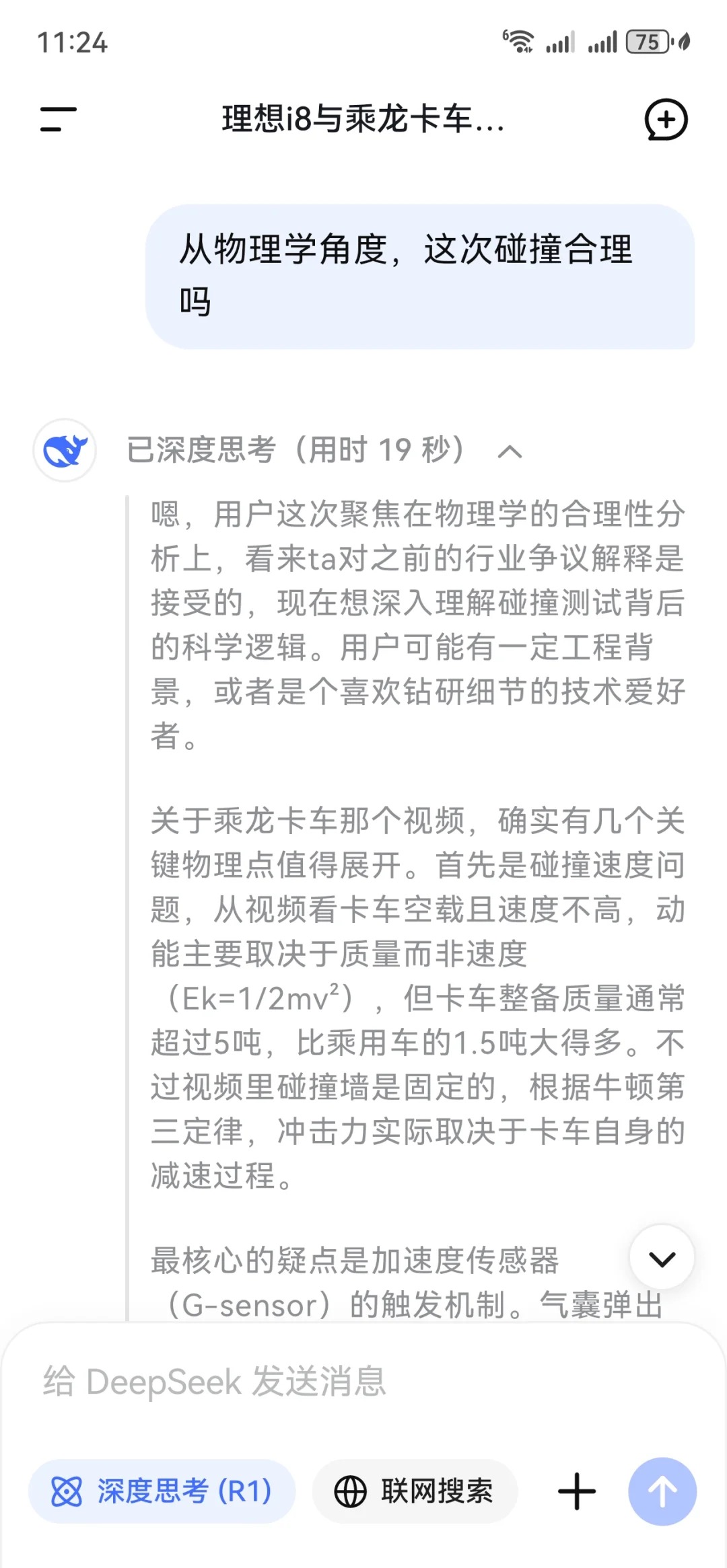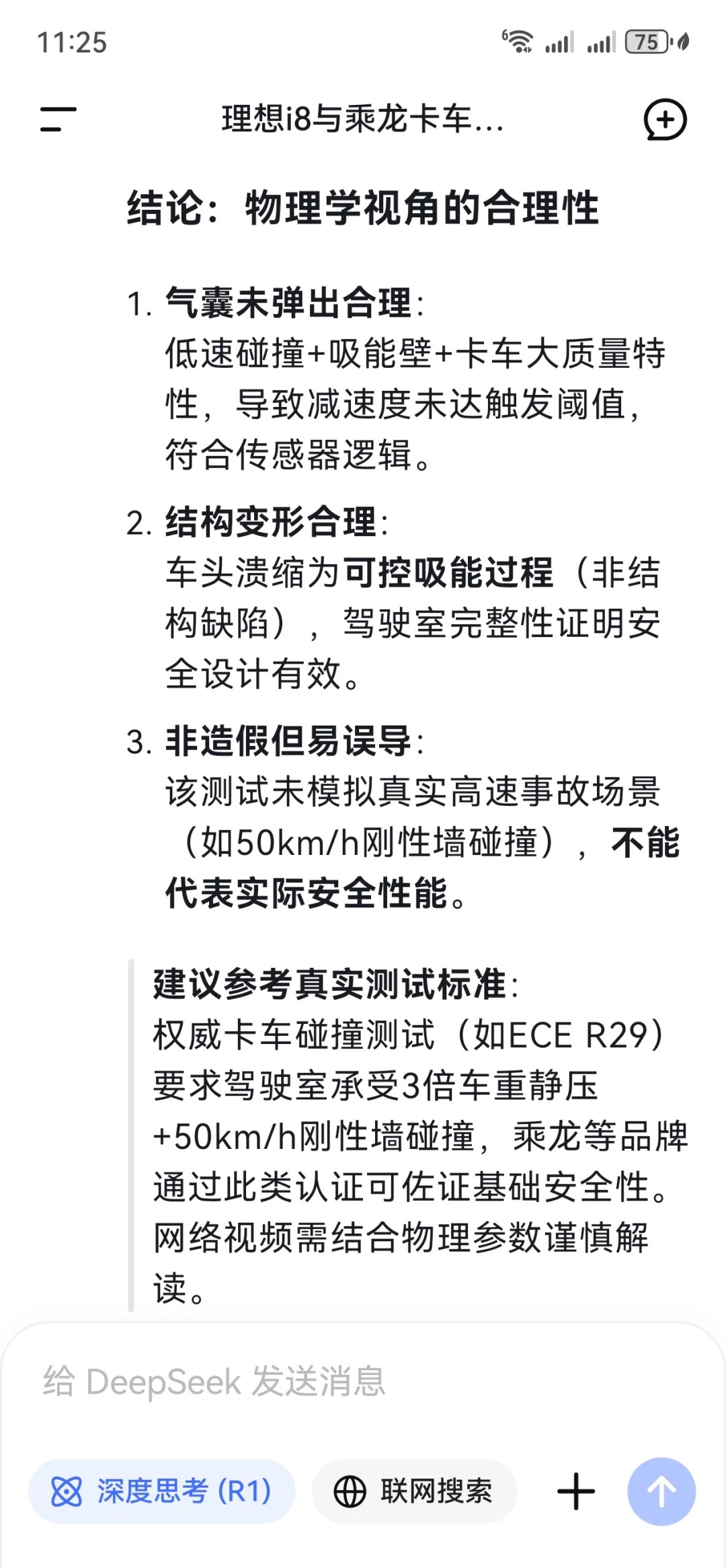 1️⃣网上很多人说理想i8和乘龙卡车对撞测试不符合物理学原理。并且怀疑测试造假。 2️⃣乘龙卡车方表达说数据不真实,乘龙卡车质量过关,不接受这样的测试结果,出面维护品牌形象。但是全网目前没有查到乘龙卡车官方要起诉理想汽车和中国汽研的举动(也有可能还在酝酿中)。 3️⃣理想汽车方高管表示没有造假,不服可以再按照测试标准再测一次,并且愿意直播,目前乘龙卡车方没有明确答复。 4️⃣测试方中国汽研表示,这次碰撞测试公平公正,没有造假,报告结果经得起检查。 所以很有意思的点来了,到底三方哪一方说谎了?还是都没说谎?我问了deepseek,从物理学角度如何看待这次碰撞(如图2-图9),直接说结果,deepseek说碰撞结果合理,但是无法代表真实场景。 这个回答满意么?