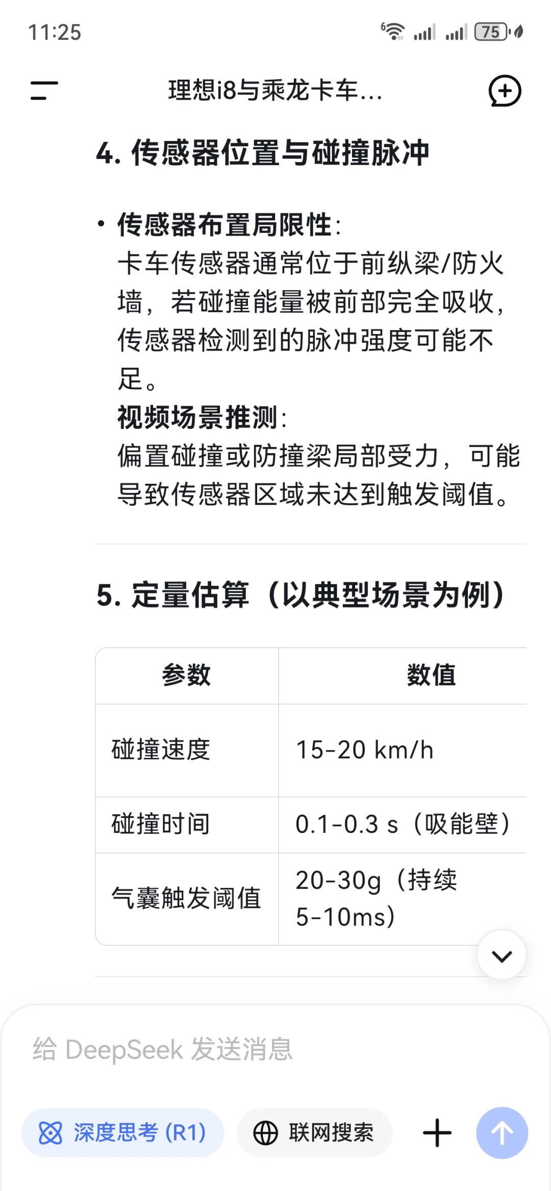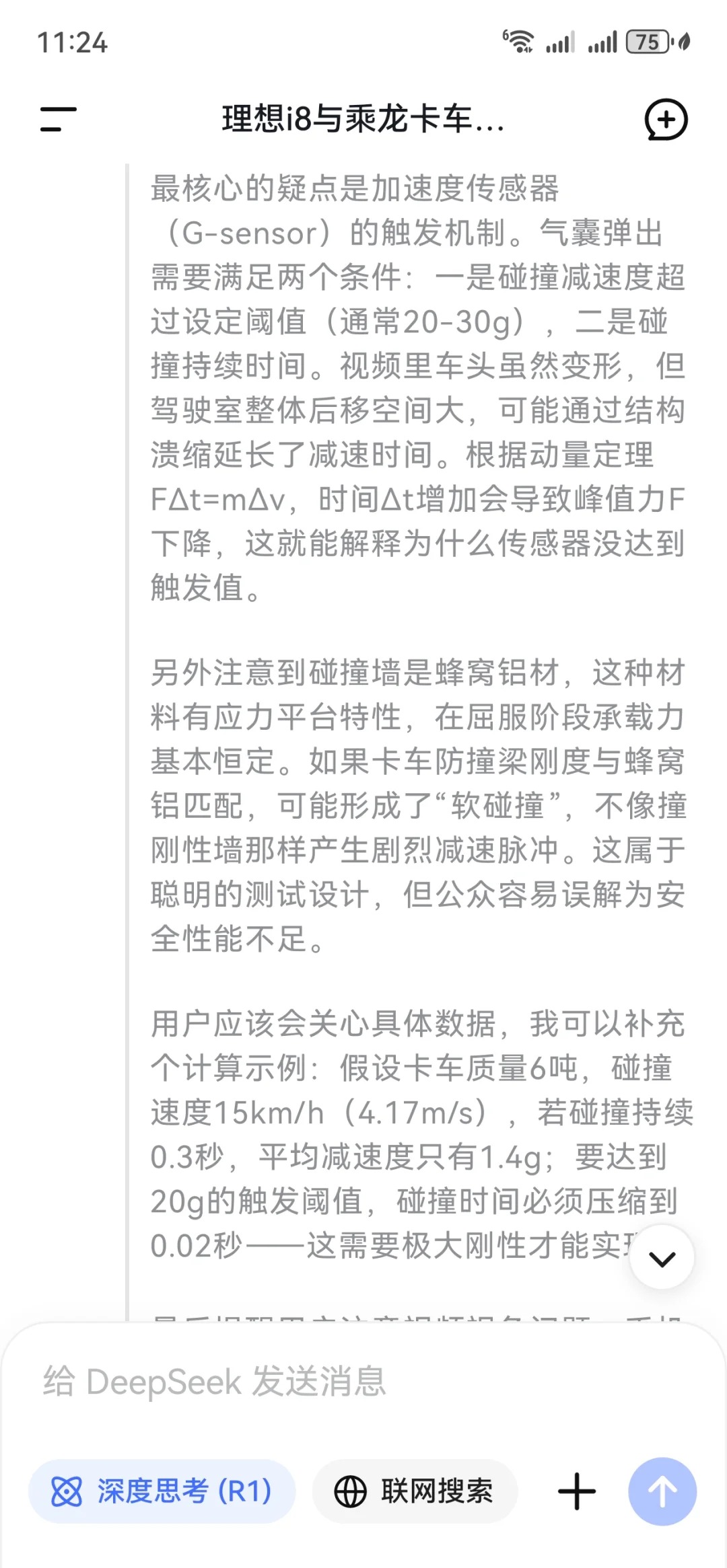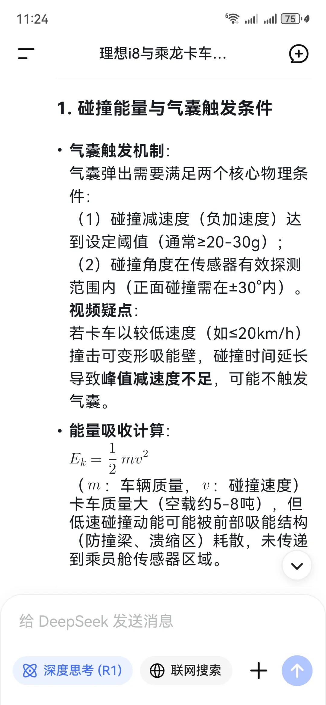 1️⃣网上很多人说理想i8和乘龙卡车对撞测试不符合物理学原理。并且怀疑测试造假。 2️⃣乘龙卡车方表达说数据不真实,乘龙卡车质量过关,不接受这样的测试结果,出面维护品牌形象。但是全网目前没有查到乘龙卡车官方要起诉理想汽车和中国汽研的举动(也有可能还在酝酿中)。 3️⃣理想汽车方高管表示没有造假,不服可以再按照测试标准再测一次,并且愿意直播,目前乘龙卡车方没有明确答复。 4️⃣测试方中国汽研表示,这次碰撞测试公平公正,没有造假,报告结果经得起检查。 所以很有意思的点来了,到底三方哪一方说谎了?还是都没说谎?我问了deepseek,从物理学角度如何看待这次碰撞(如图2-图9),直接说结果,deepseek说碰撞结果合理,但是无法代表真实场景。 这个回答满意么?
