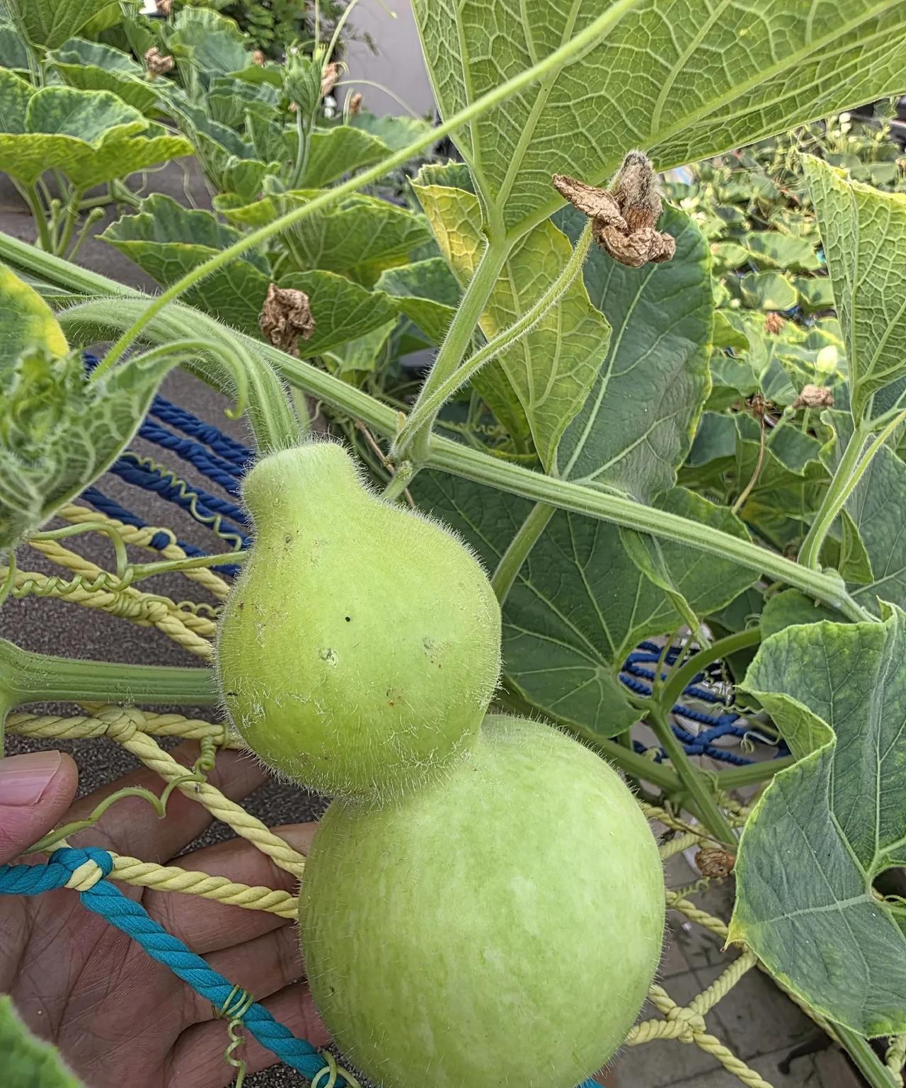 今天下午,终于看到庐山真面目…… 它不是长在屋顶嘛,那天早上偶尔抬头时看到的。当时很惊喜,在我正为今年葫芦产量很低而懊恼时,它的出现无疑提振了我的信心。我很想看看它的样子,无奈屋顶太高,梯子太矮,踩着梯子也看不到全貌,只能举着手机拍拍,走下梯子看看。 越看不到越好奇。当即下单买了一个长梯子。今天中午到货,迫不及待搬到露台,踩着梯子就上去了,这回看得清清楚楚。 你别说,这个长得还有模有样,甚至比憨妞都好看,至少它身上没有褶皱。不知为什么,我这一阵子心心念念的憨妞,身上长出棱角,一个棱一个棱的,不是那么圆润了,这就有碍观瞻,不知成熟以后这些棱角还在不在,如果在,那就影响它的形象,也影响我对它的喜爱。 屋顶上这个也有名字了,叫傻妞。今天下午我给它正了正位置,保证它在生长过程中臀部不受挤压,因为它斜躺着,半个臀部接触房顶,不调整的话臀部会变形,那就会长歪,就不好看了…… #头号创作者激励计划#
