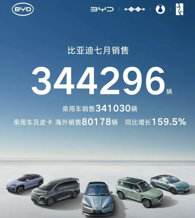 上汽与比亚迪差距越来越小了,争夺国内第一。 7月上汽33.8万辆,比亚迪34.4