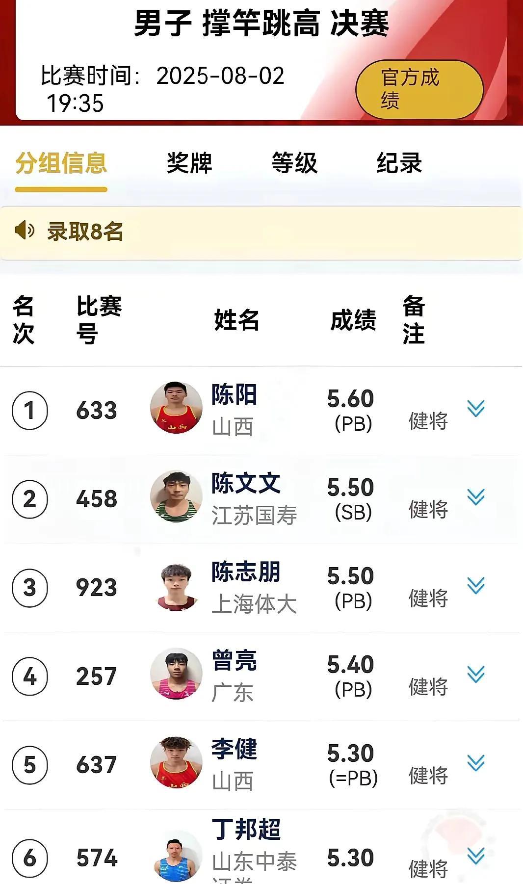 全国田径锦标赛男子撑杆跳高决赛,24岁的山西选手陈阳以5米60的个人最好成绩夺冠,陈文文和陈志鹏都跳过5米50,分获二三名,个人最好成绩达到5米75的安徽名将钟涛三次挑战5米30未果,无缘前八。