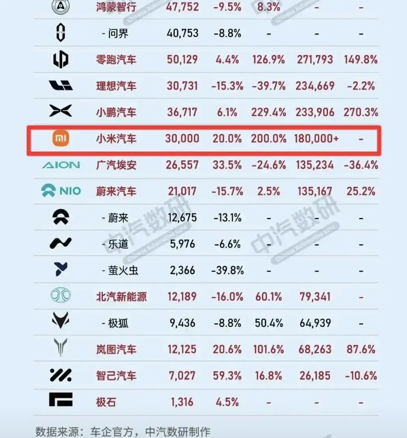 小米汽车被产能限制了,单月卖30000,环比增长20%,同比增长200%。这些数字都是整数,说明小米的产能就这么多,生产多少就能卖多少。明年这个时候小米产能翻倍的话,你看到的数字就60000台了,应该是汽车产业140年最成功的车企了。